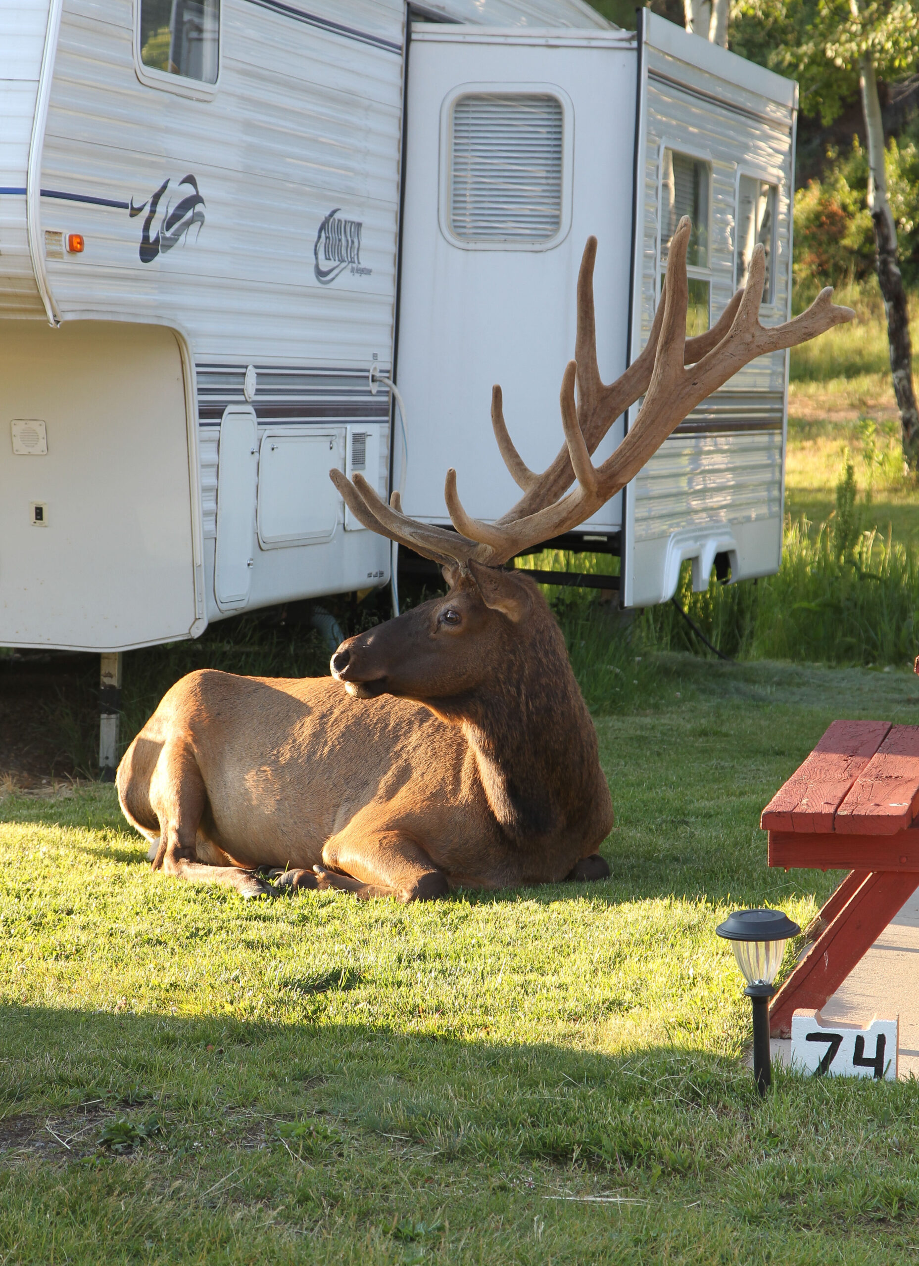 The next day we woke early, like we usually do, and Joanne opened the door to the RV and all I heard was a gasp. She was so excited and waving franticly for me to come and look. About 15 feet from our camper was the biggest elk I had ever seen sitting on the ground with 2 females next to him. When I say big, you really have no idea. This Elk was a beast. He didn’t seem bothered by us at all and we decided to grab a few pictures