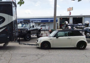 7/14/16 We depart Newmar for an appointment at Dan’s Service Center “Hitch Specialists” in Elkhart, IN. Dan’s Hitch has come highly recommended and although we have a tow-bar system already we need to have some modifications made to complete the set-up with our new coach. Arriving at Dan’s Hitch we quickly realize we have come to the experts. They examine our Mini (tow car) and then take several measurements. It’s decided that given the drop between the RV’s hitch and the Mini’s Base plate we need a custom 12″drop fabricated. Dans Hitch is full service and after taking the measurements they disappear into the shop for several hours only to emerge with a custom welded drop system for our set-up. In addition, they added the necessary brackets to allow us to also mount our bike rack as well. Dan’s Hitch was professional, knowledgable, quick, and made sure we were set for the ride home, towing the Mini behind our new RV.