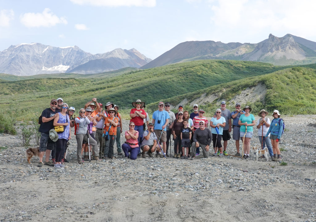 Throughout the weekend we have so much fun with these fellow participants…  There is a very flexible schedule set up by our hosts for the 5 days which includes, a pot-luck breakfast Sunday morning, a group hike on Sunday afternoon, group picture time, a pot luck dinner Monday evening, and daily evening get-togethers. Actually we find there is plenty of time to catch our breath and relax after moving at such an exhausting pace thus far on this Alaska adventure.  We are very lucky that with our WeBoost Cell Booster and AT&T hot spot… we are one of the only ones with connectivity at our RV. 🙂