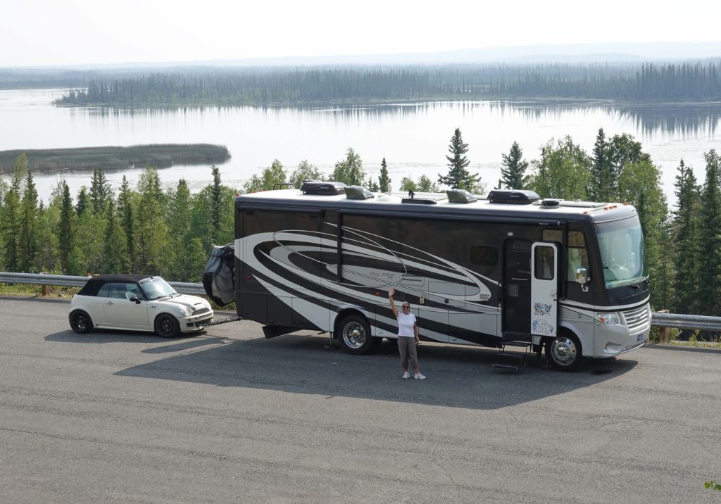 Departing our Escapers Rally Boondocking location is literally the turning point in our Alaska Adventure. We have been traveling North for months and today is the day we begin our turn-around point and start the long trek South again… We first must drive slightly North before connecting with the Alaska Highway in Tok, AK and then onto Delta Junction and South. The drive is (once again) not on good roads so it takes a bit longer then we expected. After seeing that we can dump, take on water/propane and wash the vehicles for free with a gas fill up at Tesoro in Tok, AK we spend about an hour doing some routine camping chores. Joanne has seen a recreation area to camp a little further South but we actually opt for a a great pull out above a lake with an amazing view of the Wrangell- Saint Elias Mountains. Another nice boondocking spot for an overnight. We are a little hesitant as the news has been continuous about the tragic murders of a few people around Liard Hot Springs that hasn’t been solved yet. The latest news has the two suspects in Saskatchewan so we felt we should be fine. We put the bear spray in the passenger seat back just in case! …This is an awesome boondocking site and we have a very quiet night.
