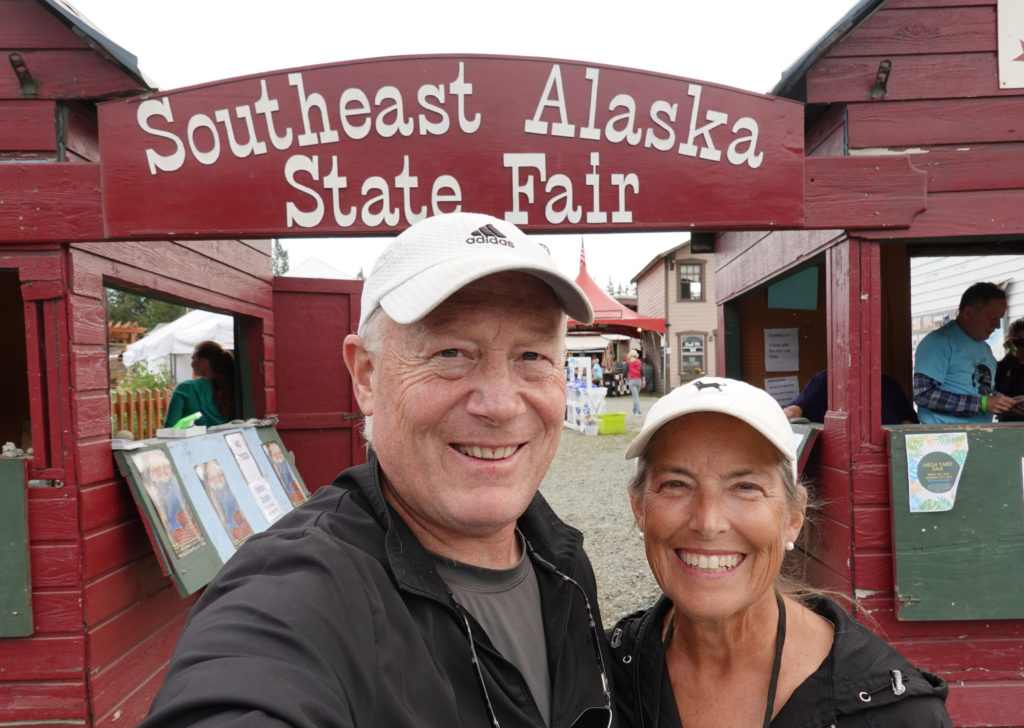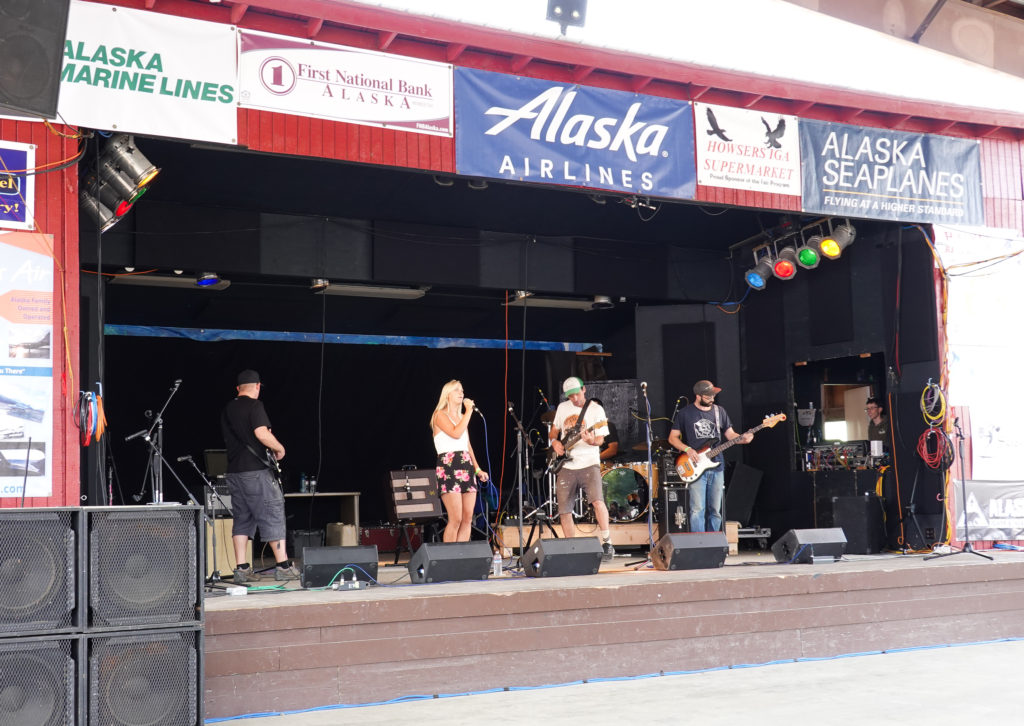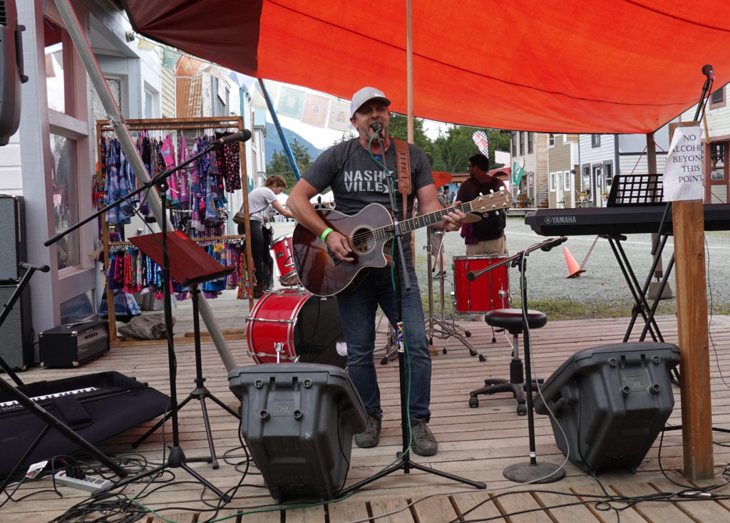Friday we look at the forecast and decide this will be the best day to do the fair. Our expectations are not very high because we know this is a very small area so there can’t possibly be a lot there. Plus, with the ferry system on strike, it prevents a lot of people that may have come from Skagway or Juneau from coming over. As we get to the gate to pay we are surprised that they only charged us senior price (didn’t see any signs for senior rate) so $6.00 per person instead of $15.00. Lucky! As we wander around we finish most of the fair in an hour (maybe less) and on the way out meet Lisa and Bill (LaGrange couple) whom had just arrived at the fair. We chat a bit then go our separate ways agreeing to sit at a campfire this evening. On our final stroll through the Dalton City (White Fang Exhibit) portion of the fair we come across a singer / songwriters open mic program going on at the beer garden. This turns out to be the high point of our fair visit…as we grab some beers and enjoy the show!