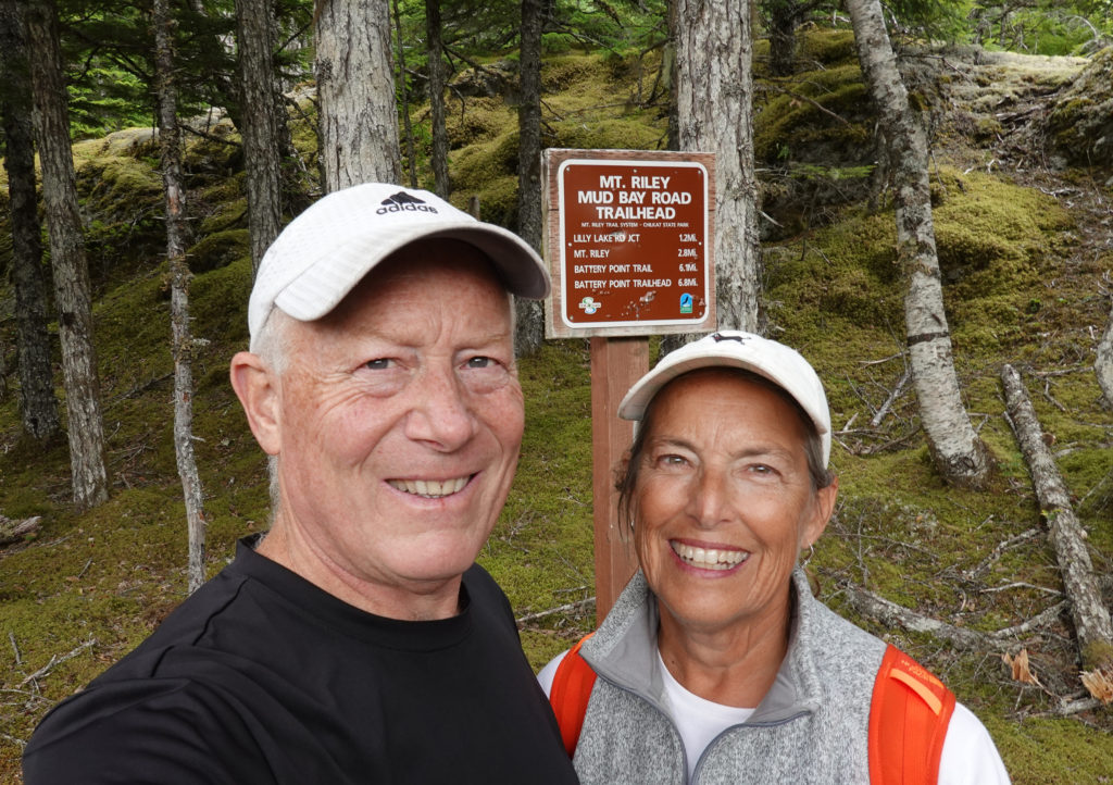 From there we head to the Mount Riley trailhead. This is noted as a moderate 2.8 mile (one way) hike. As we begin we notice bear scat (fresh!) on the trail so we are thankful we remembered our bells and spray! We still are careful and carry on a good amount of conversation to alert any bears in the area that we are there. As we get deeper into the trail we realize this is a more difficult trail than we anticipated. But we are prepared with trekking poles, various layers of clothing, and plenty of water. We are alone on the trail except for a young couple that is running the trail! Yikes- to be young again!
