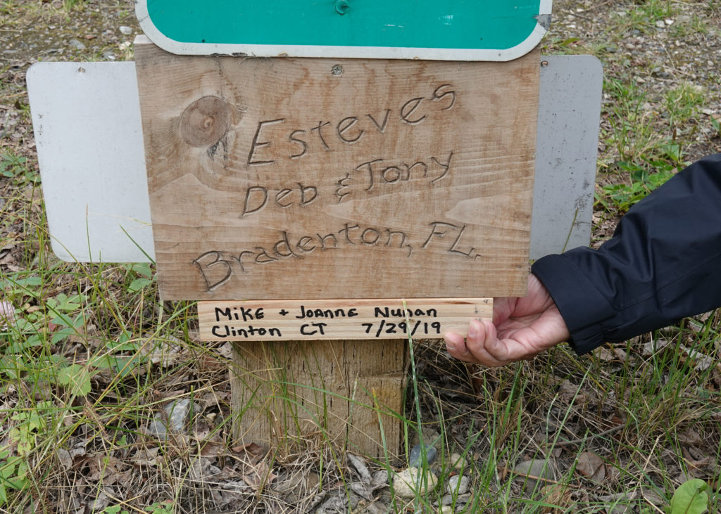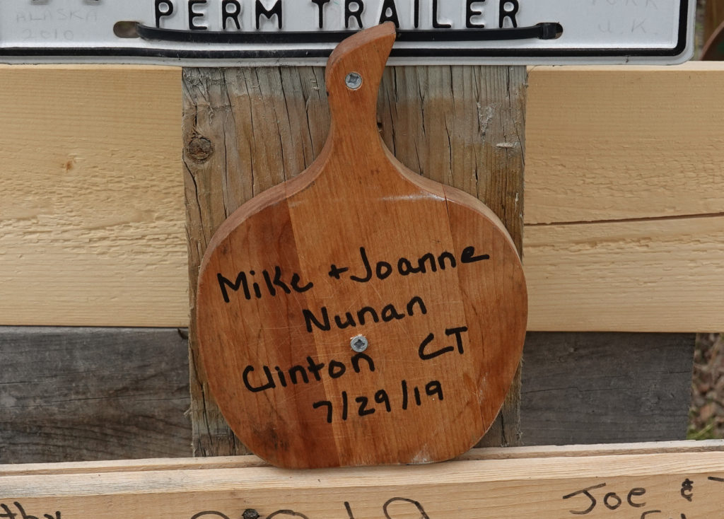 We still wanted to check out the visitors center / Alaska Highway museum so we plan to get an early start in the morning to do these on the way (and also get a little more Canadian cash for the remainder of the time we are in the country. The museum is interesting, the visitors center rep is full of info for our next few stops and we take another sweep through the sign post forest. We look again at the sign we posted- we had originally thought we wouldn’t leave a sign (seemed kind of corny), but once there we regretted not planning and we made an impromptu sign using an apple cutting board and sharpie! Not sure how long it will last but it’s there! We posted our sign in the second row facing the Northern Lights Centre. It is the 3rd-4th sign up from the bottom. It is wooden cutting board of wood (small). Then we hit the road for another long driving day.