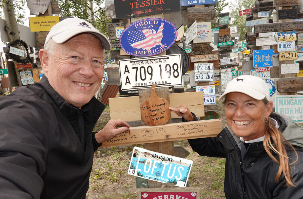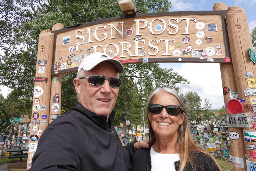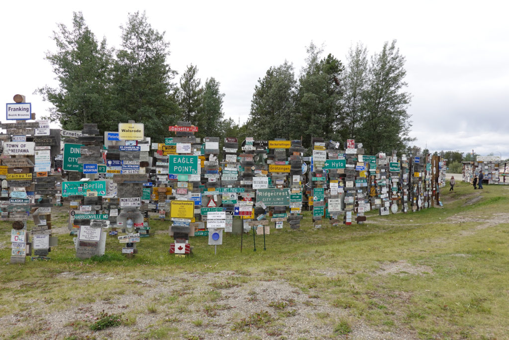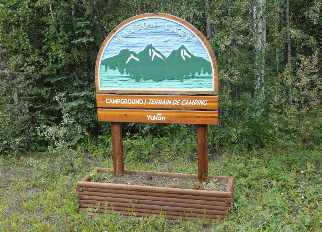 Another long day of driving and although the scenery is always beautiful, these long driving days are exhausting. We are looking forward to getting to Watson Lake and checking out the sign post forest. Joanne’s Mom and Dad left their duck sign there 26 years ago and Joanne’s sister Deb and husband Tony left their sign there 5 years ago. We find Watson Lake Yukon Government Campground just before pulling into town so we pull off to check it out. Ugh! The road in is HORRIBLE! About 6 km of pot holes, washboard and just in general a slow going, stressful route/access road. Once we get in it’s not bad and we set up and get organized. We had gassed up on the way in and sort of checked out the Sign Post Forest finding Deb and Tony’s but not finding Mom and Dads signs/contributions.?