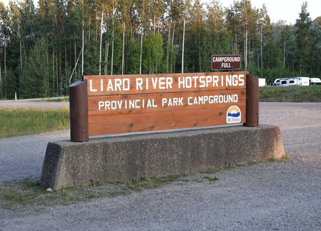 Today we land at Liard Hot Springs and Hope we get one of the first come first served camping spots. The drive is longer than we anticipate and as we pull in it already looks full. We drive through and there is literally one spot left #48) which is shared with another camper. Since there are 5 campers behind us we grab it quickly but have to tie up traffic as we unhitch the toad then back in. I won’t lie when I say the traffic behind us are not happy- but given the layout of the park we have no choice- and you would think other campers would realize this.