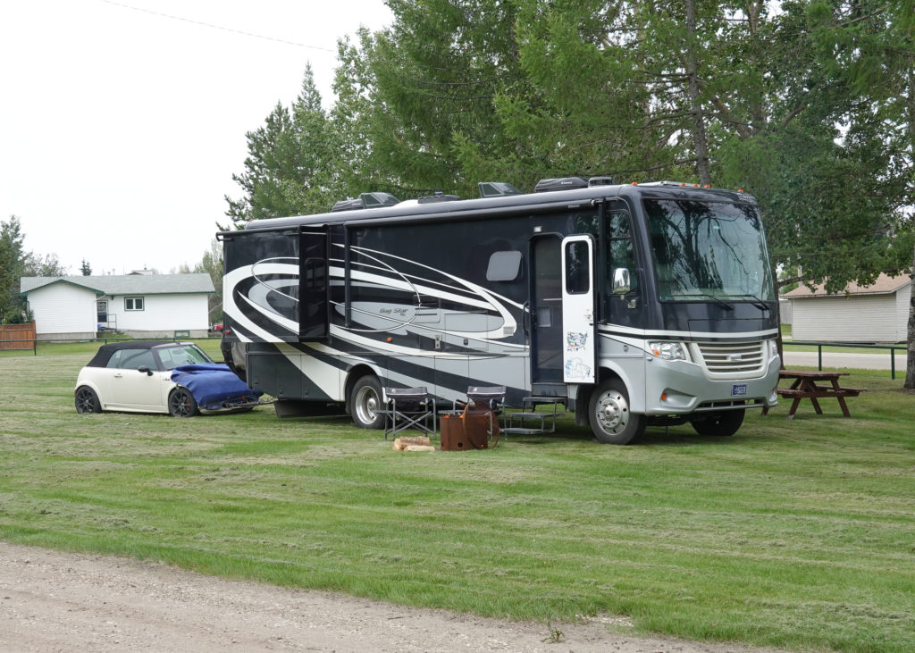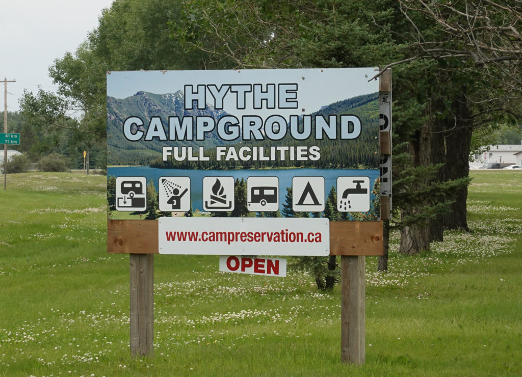 Continuing south on this long day of driving we come across a municipal park right on Main Street in the town of Hythe, Alberta. (Yes we are putting another Canadian Province on our wall map tonight…) We originally had driven past the park, but see how nice it is, so u-turn around to check it out. For $15.00 US we can park (really anywhere) in the grassy overflow so we don’t have to disconnect. After a call to the manager we settle in, pay at the kiosk and pick up the free firewood he told us about! A fire and a glass of wine and we are good! A nice quiet night as we leave our Alaska Adventure behind us and look forward to our next stop going South on this Revolutionary Journey….