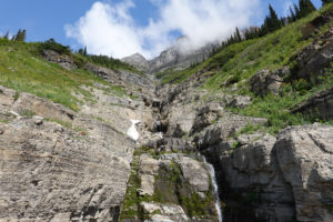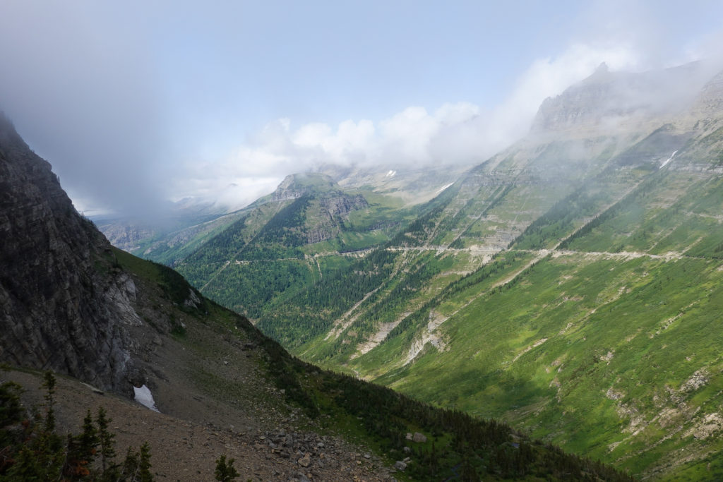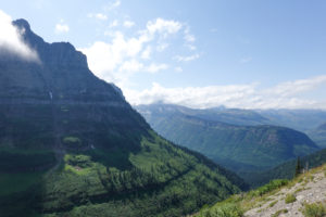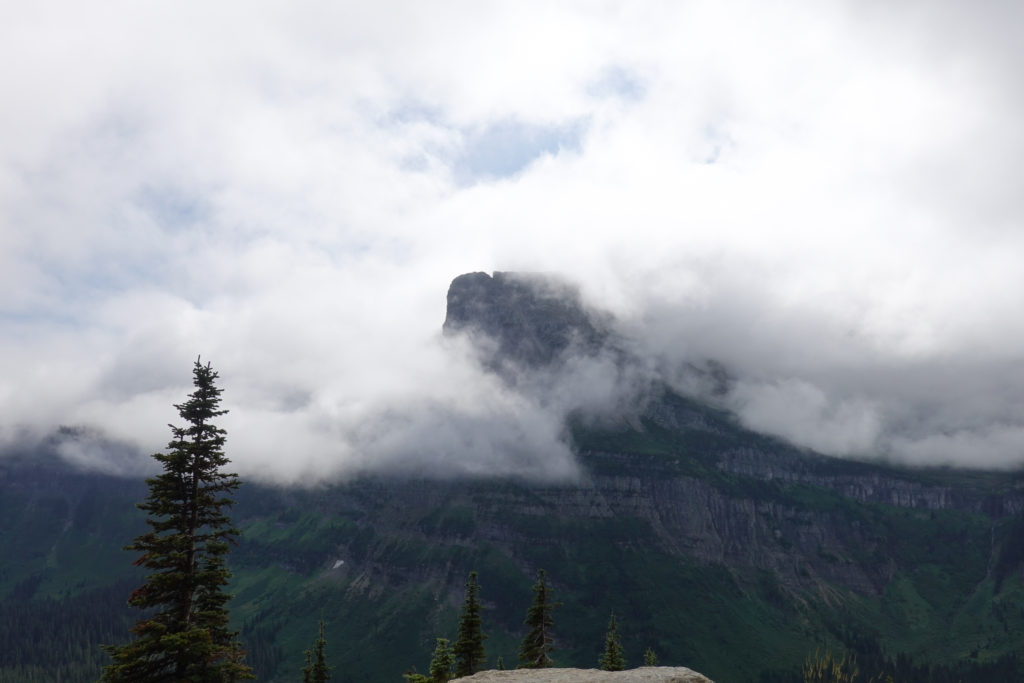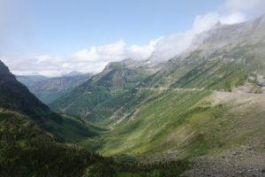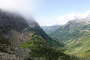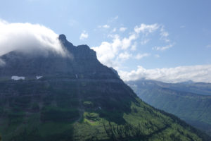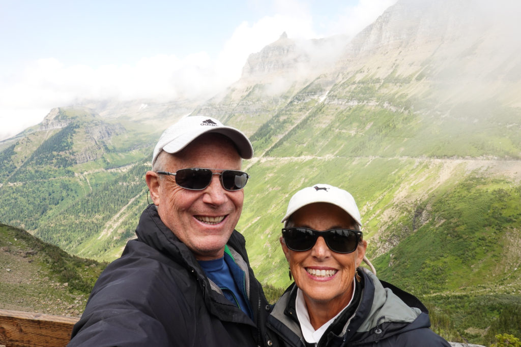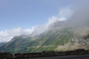 “The Going to the Sun Road” is again a spectacular drive and it brings back so many great memories of when we did this with the kids in 2001. We stopped at the visitor’s center and Joanne gets a stamp in her passport book right next to the stamp she did in 2001! Surprisingly we notice it is almost 18 years to the day since last being here. (Actually we are only 1 day apart! ) We were doing this drive on August 11 that year!! Not much snow around compared to back then and not much glacier left. We do see some sheep and the lakes, rivers, mountains, wild flowers, glaciers and clouds certainly make for an awesome drive in the mini with the top down.