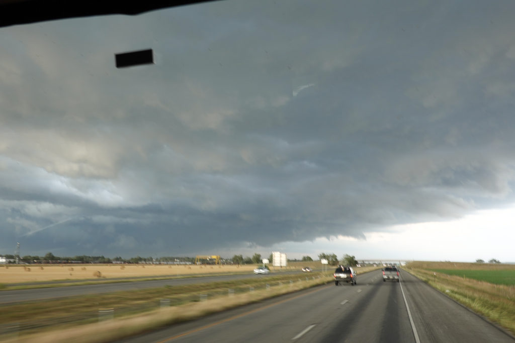 These two days are very long driving days so Joanne does help Mike a little with the drive. The first day (Sunday) we find a Cabelas in Billings, MT but the last two hours of driving is very strenuous as there were tornado warnings all around us and the wind was incredible. Mike is doing everything he can to keep the rig on the road with many tractor trailers nearly tipping over in front of him. Joanne continues to monitor emergency reports on her phone and watch the very dark clouds and for any sign of a funnel… We both will admit this might be the scariest moment of driving since starting this Revolutionary Journey! Aside from the eminent threat of tornadoes Montana is really a beautiful state, unfortunately there is really nowhere to escape a tornado along this stretch of road..! Only field after field, after field! We are so happy when we finally pull into the Cabela’s RV parking lot although the wind is still bad. Now if we have to abandon the RV we fortunately have a large building to shelter in… The night ends up quiet with many RVers in the lot. We find out several days later that nearly 11,000 birds were killed in the winds we traveled in that night found strewn along the highway…We definitely dodged a dilemma this evening!