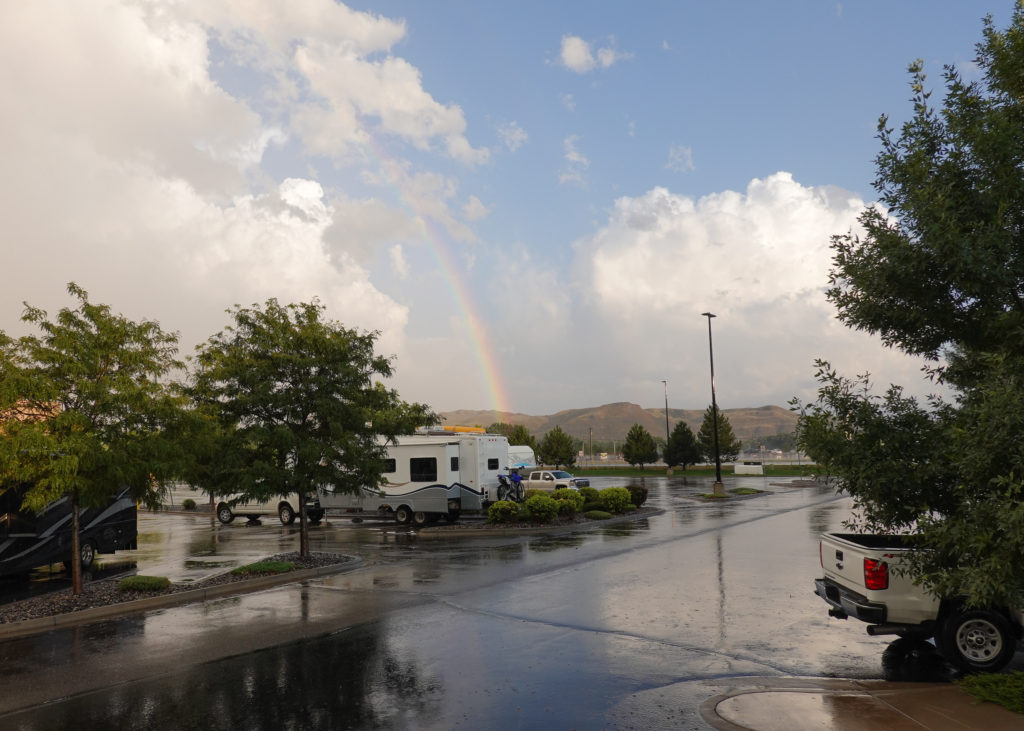 After we descend we spend a bit of time in historic Manitou Springs– a cute little tourist town. It is very fun to stroll and peak in some store windows. Afterward we head back to the “campground” and relax for the evening. There is a cool Boot Barn Hall across the street that is having a concert this night and although we discuss walking over we eventually decide against it. It is not loud and all the festivities are over by 10:00PM. For a free camping place this was awesome! There are a few picnic tables and a grassy area for dog walking. We have a little garden area right outside our door. THANKS again Bass Pro Shops of Colorado Springs, CO!