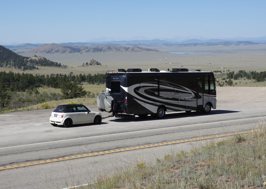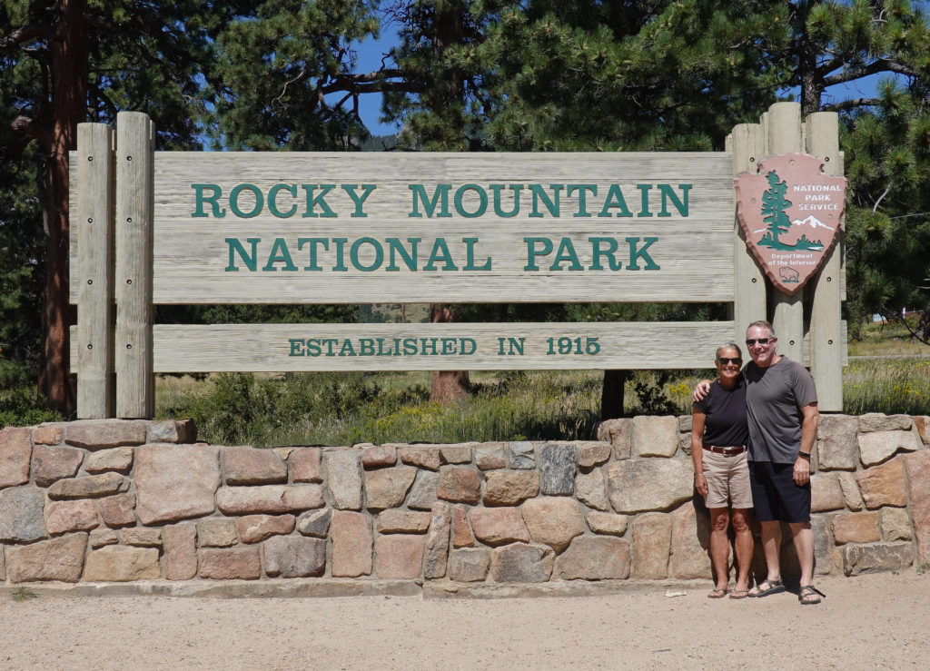 Tuesday: we have some time to kill because the drive to Estes Park is only about an hour and we can’t get on our site until at least noon. So we head inside Cracker Barrel to have a relaxing breakfast. After we get all set to go we pull into another Sams club for gas as it’s right on the way! The drive up 34 through the canyon is another spectacular drive that we remember from 2013. We make a stop about a mile from the campground where Mike has found an RV wash place. Takes about 1/2 hour and $20.00 to wash the RV and Mini, but it looks so good finally clean again!