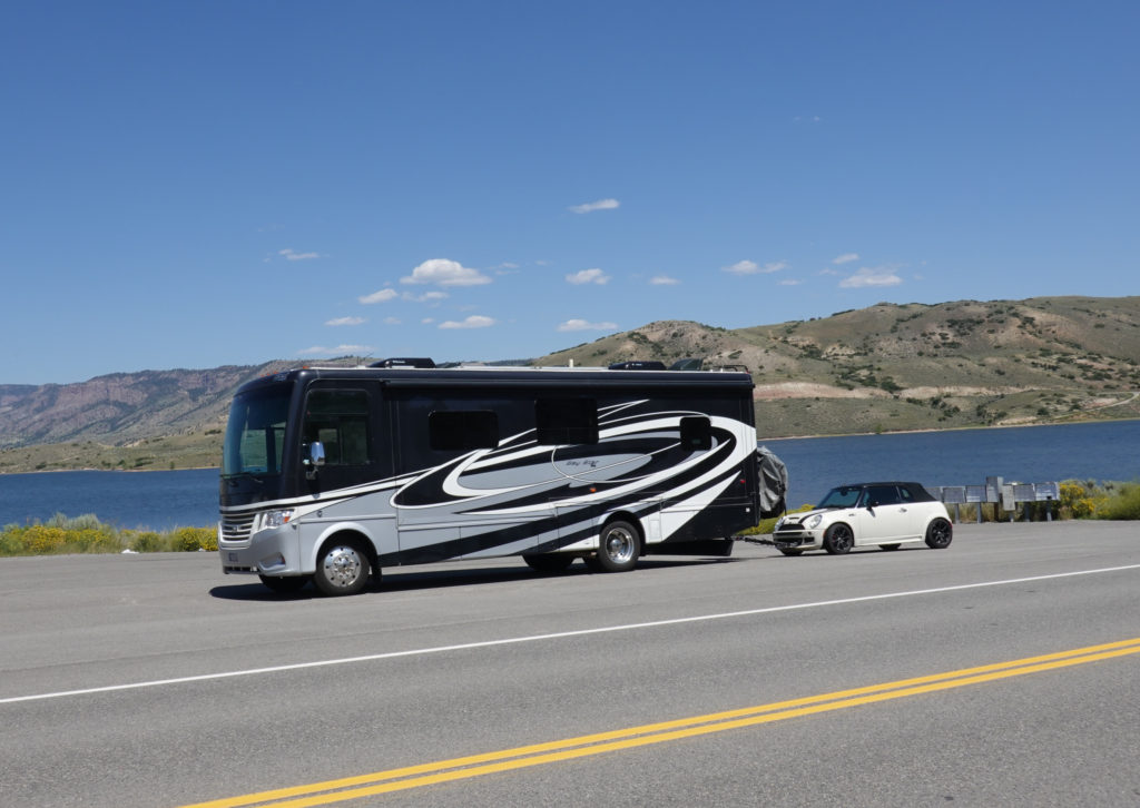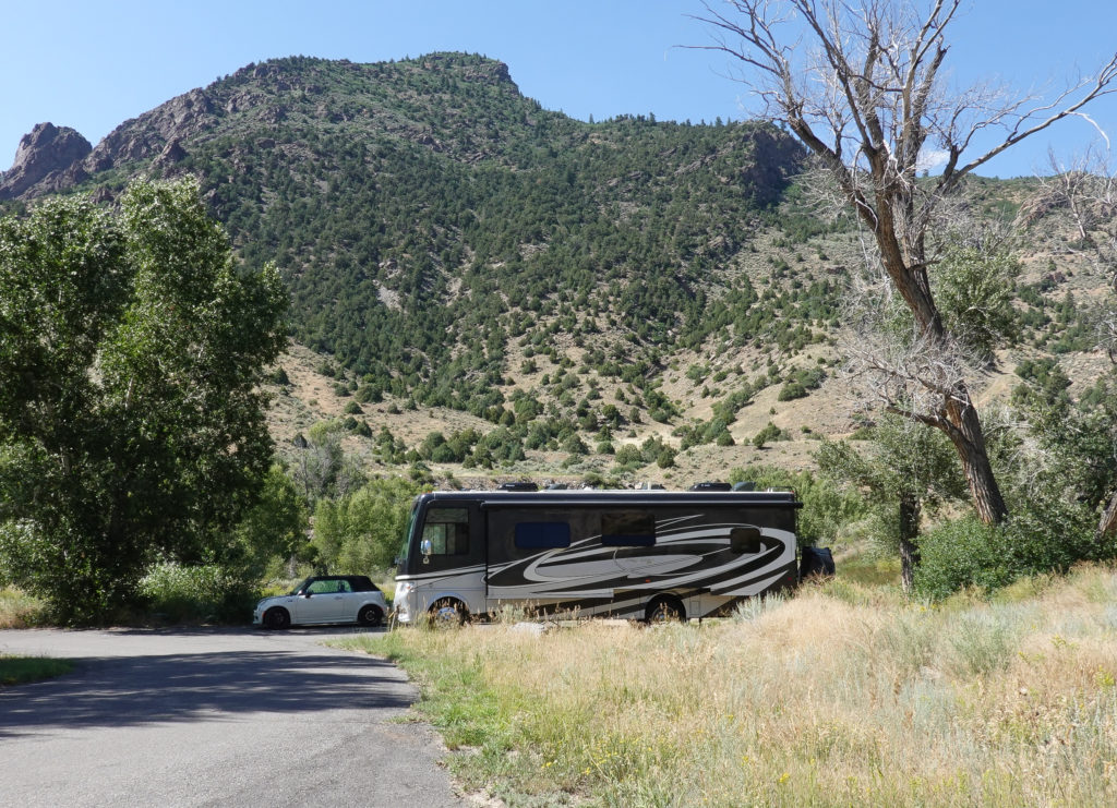 The drive across 24 then onto 50 is spectacular! The drive over Monarch Pass at 11,312 feet and past Monarch Ski Area is amazing and is definitely pushing our RV to it’s limit towing the Mini. The coach still manages well enough and the Tow-haul feature along with the 6 speed transmission works wonders on our descent without having to use our brakes too much. After passing through Gunnison, and the turn-off for Crested Butte, CO we start seeing some very beautiful lake areas which includes Blue Mesa Reservoir, and the incredible “Curecanti National Recreation Area” which was created by several dams holding back the Gunnison river. We see many lakes on Route 50 with camping directly on the water. We discuss stopping though decide to push on to our original plan.