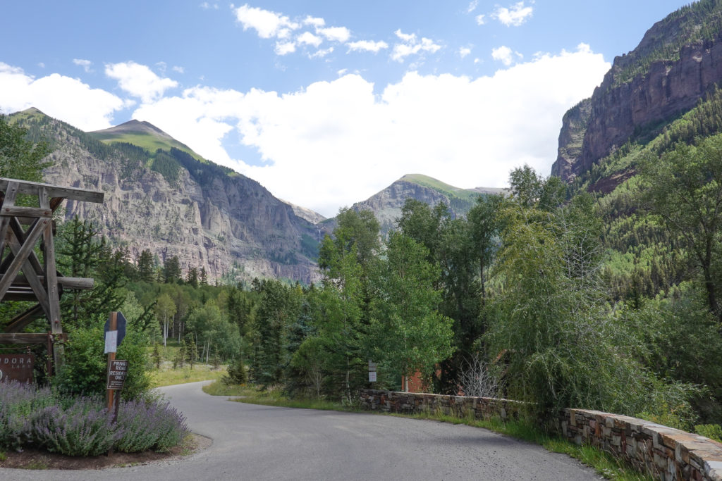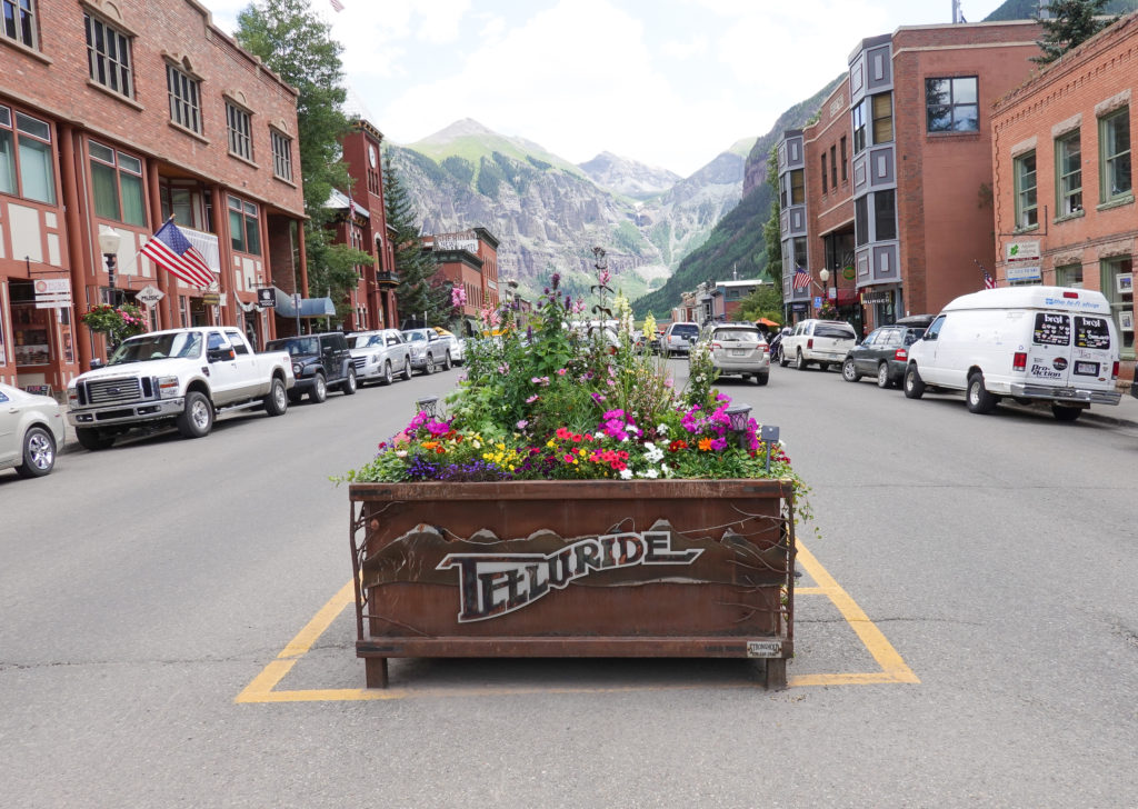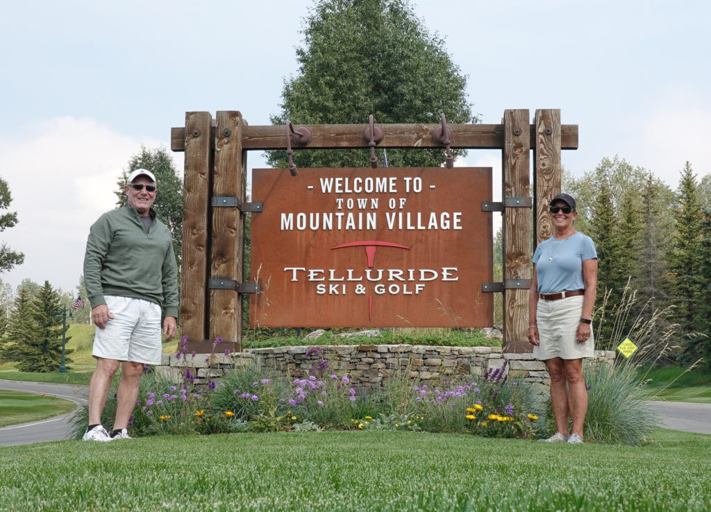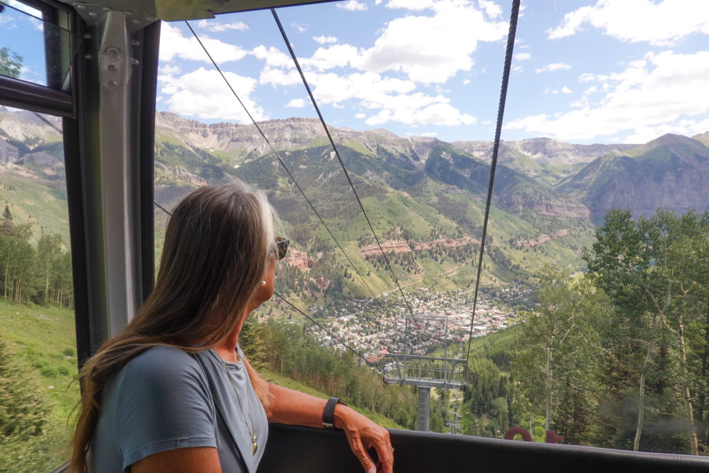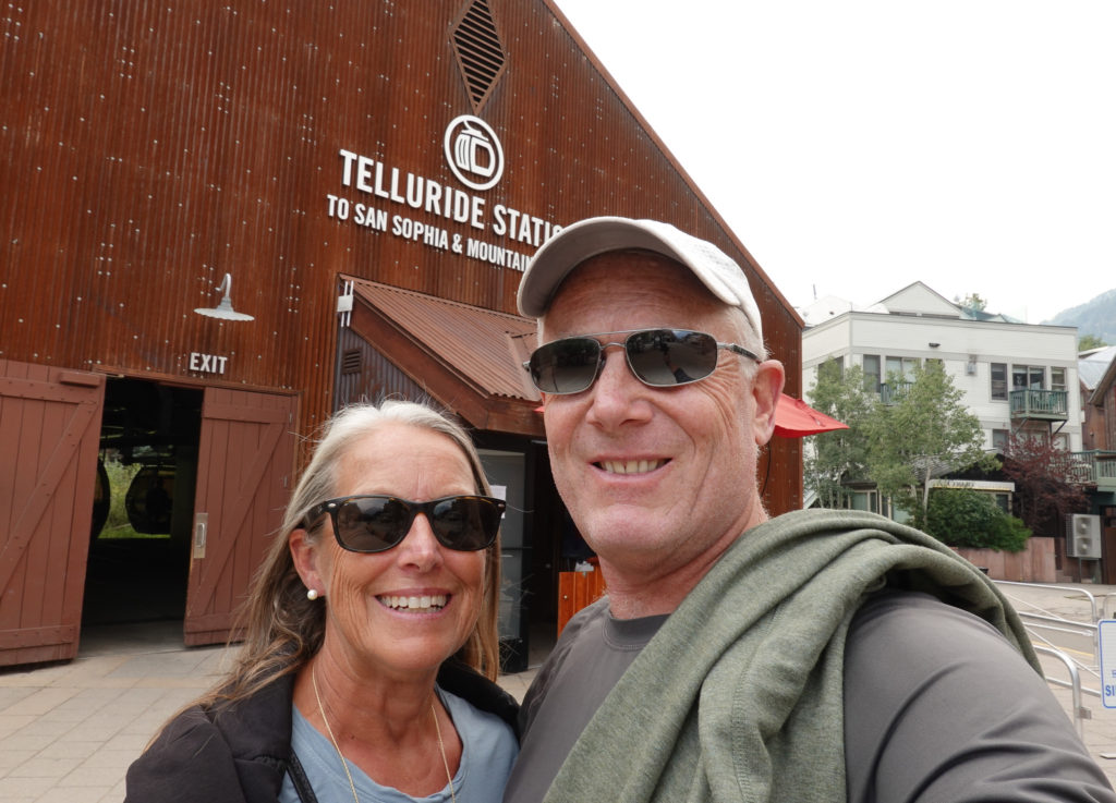 Today we plan a drive to Telluride. As we walked through the CG last night we met up with some people that are using the CG as base camp for exploring the area. They explain a good way to “do” Telluride. As we head in that direction, parking is FREE in the parking garage at Mountain Village (on the way) then you take the FREE GONDOLAS (2 of them) down into the village of Telluride. This works perfectly! Plus it’s like a free attraction! A great view of the area from the gondolas and we didn’t have had to pay to park in Telluride Village. (This was a bonus recommendation from other campers – THANKS).