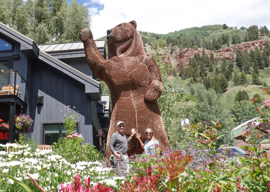 We exit the gondola and start to stroll through town. Note: (if you forget to put sunscreen on the little information booth, right as you exit the gondola, has it right on the podium! Free to lotion up!) Looking at the shops and restaurants we find a nice walk/hiking trail along the river and come across a HUGE bear made out of pennies! Very cool! It’s just in someone’s front yard. We meet some people along the walk and chat for the walk back. We decide to get a bite and brew at the Smugglers Brewery in town, sitting on the patio. Another amazing day! We take the gondola and travel in reverse to get back to our awesome campsite!
