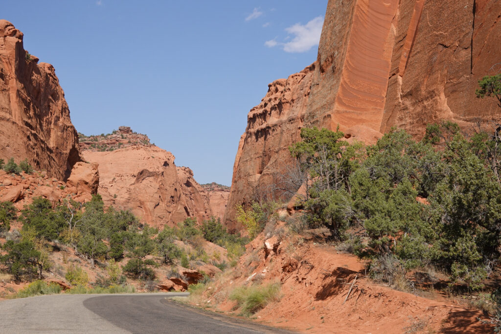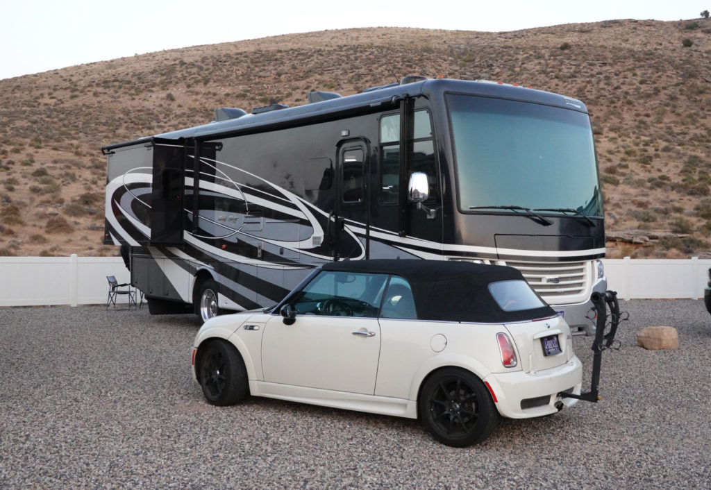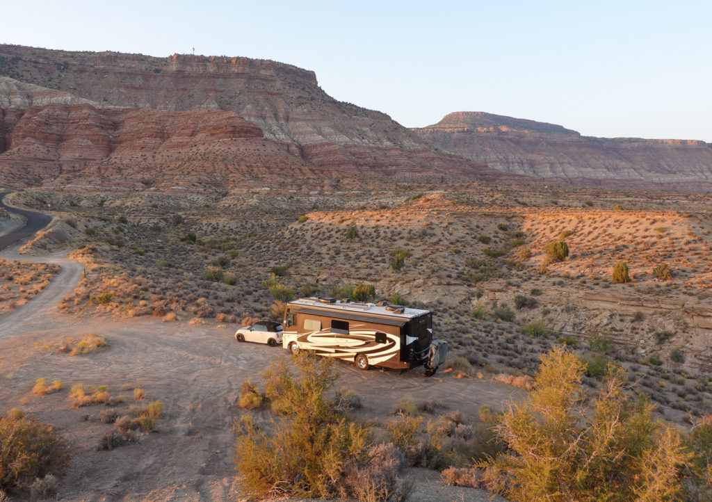 That thought turned out to be slightly premature… To get to the pavement we had one final very difficult hurdle which included a descent into a terrible washout followed by a daunting climb up to the paved road through heavy sand piles surrounded by more pot-holes and rocks. We both held our breath which seemed like minutes as we pushed our little Mini to the edge accelerating way too fast down so we would hopefully have enough momentum to get us through the heavy sand. We both knew we were so close but this final obstacle was daunting to say the least…. With the car’s engine just screaming, the entire vehicle fish tailing from side to side, and the threat of us getting totally bogged down in the heavy sand, so close to pavement, we both were just astonished as we crested this final hill! We were both emotionally exhausted as we surprising made it to the pavement. We looked at each other and couldn’t believe we had made it without being stranded in the middle of no-where, with no help in sight, no cell service, and without destroying our little tow car… This drive will be an adventure we will never forget and hope we never ever have to experience again. -Roads like this would be a strong case for a jeep to tow…We have never been so thankful and happy to get back to civilization! (Note: we don’t have a lot of pics of the Burr Trail & switchbacks… TOO stressful for the camera????)