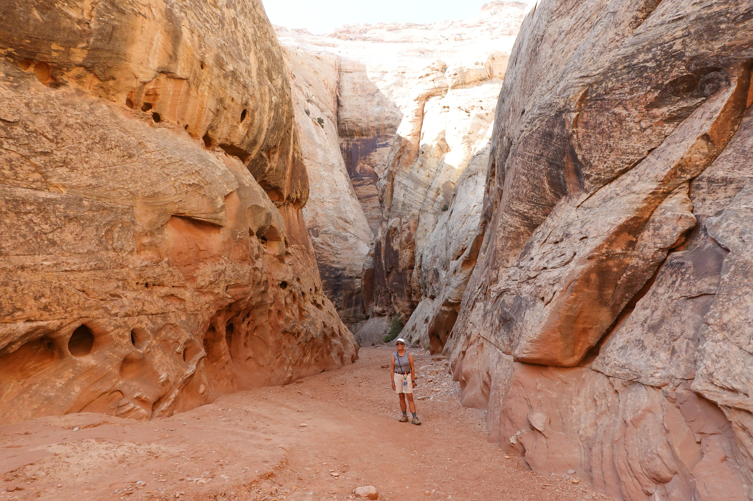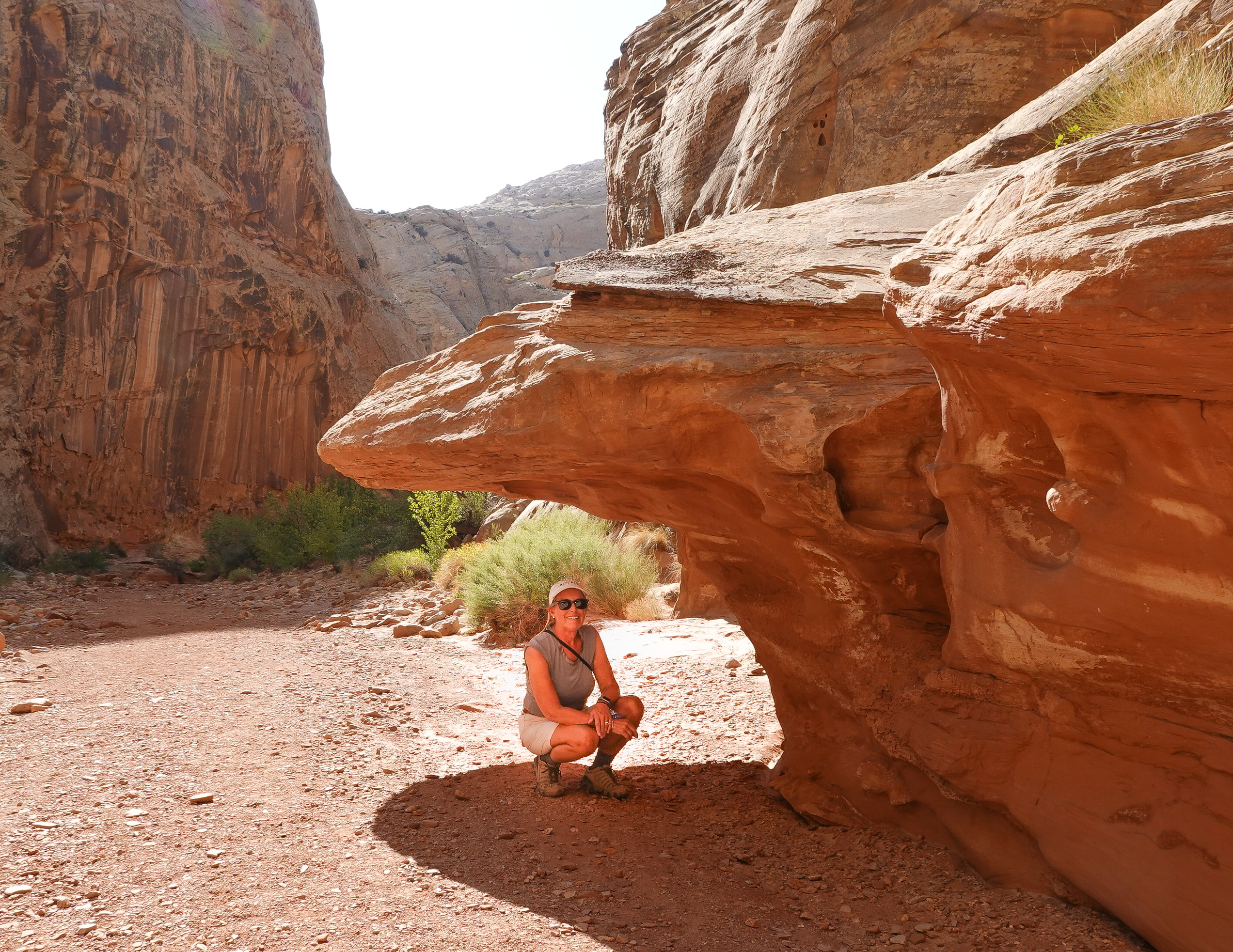 We opted to take the paved scenic drive in the park, past Fruitta, and then hike the “Grand Wash Trail.” We started the hike in the middle of the afternoon and although it was hot it was a fairly easy 3 mile walk through the wash and slot canyon. Nice hike and although we had to drive on another dirt road for about a mile to the trail head we both agreed, in contrast to yesterday’s adventure, it wasn’t much of a problem… Later we found that access to this hike would have been reachable from Rte 24 on paved surfaces on the other side of the park (Wish the ranger at the visitors center had told us that. We arrived back to the RV park late but had a nice dinner and relaxed for the evening.