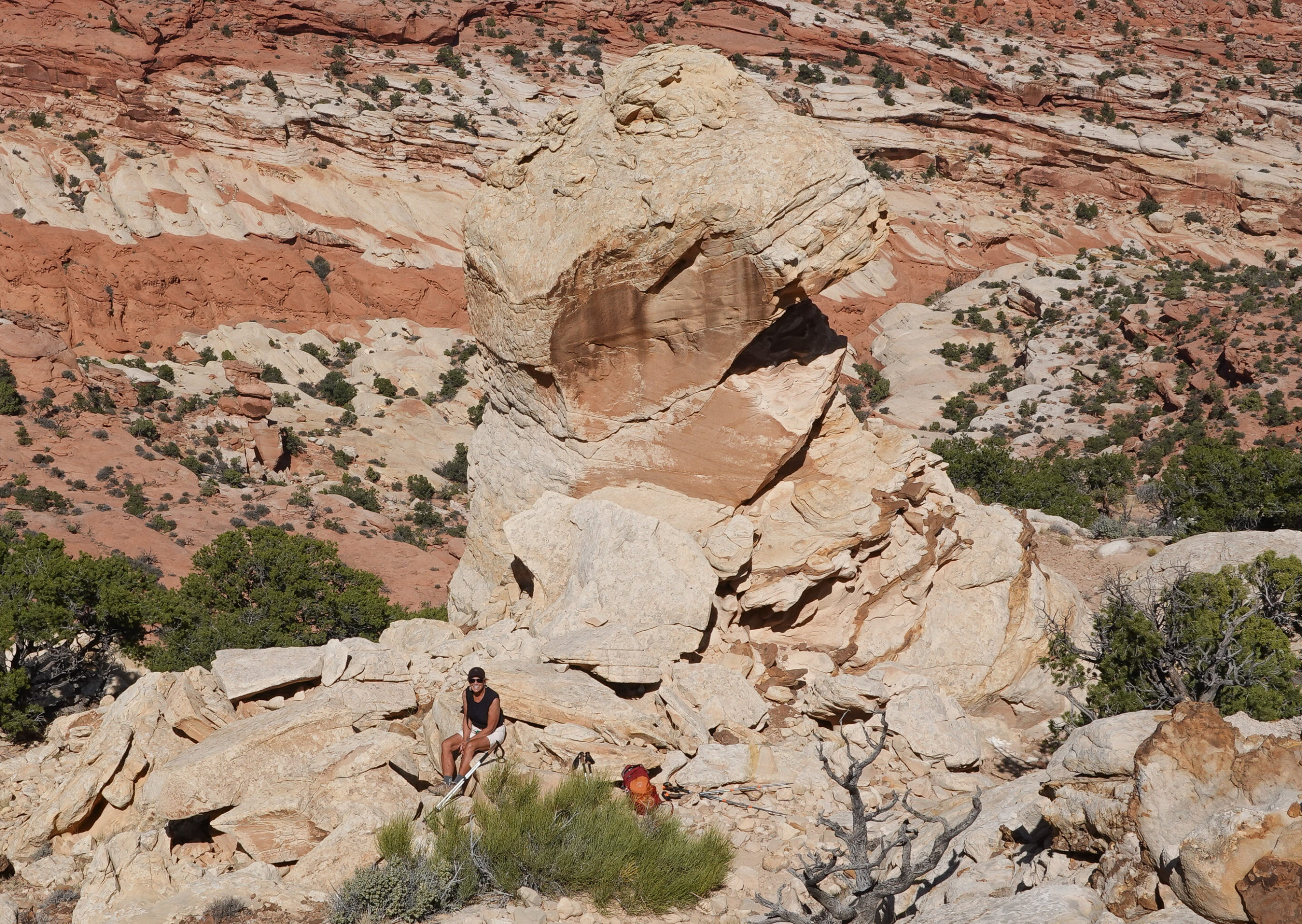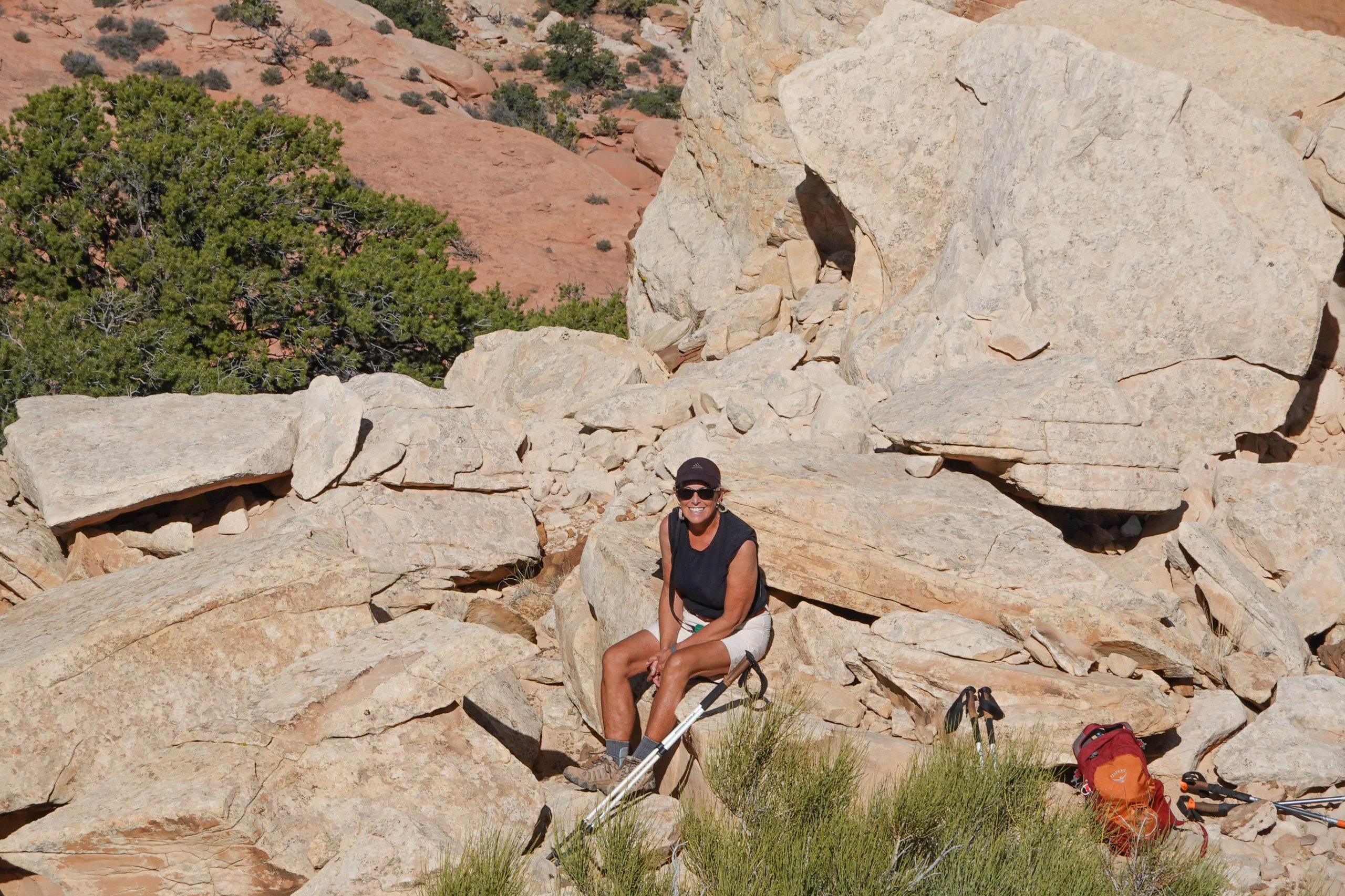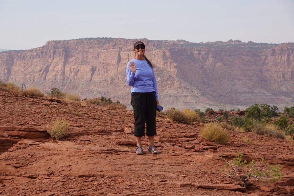 As we sat enjoying the view here, we engaged several others hikers that were returning from The Navajo Knobs Trail. The Navajo Knobs Trail is an extension of the Rim Overlook trail which adds an additional 5 miles to the hike. Of course Mike is all in while I am hesitant. Originally we hadn’t planned on doing this extended hike and with the temps in the 90’s on open slick rock surfaces and a total of nearly 2,000 feet elevation change we hoped we had enough water for the added 5 miles… Deciding to continue on we ask if anyone else sitting and chatting with wanted to tag along. One woman named Anne wanted to do it but not by herself (she is on a road trip by herself).