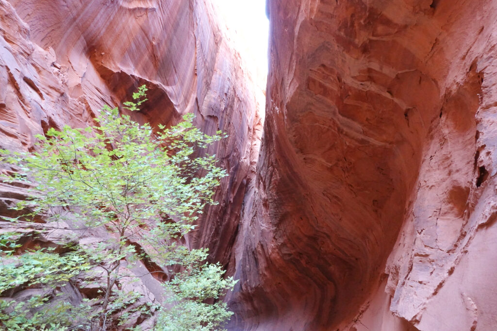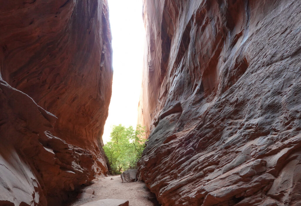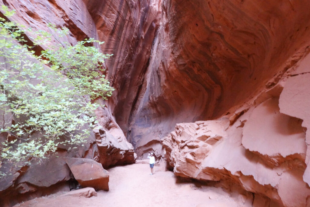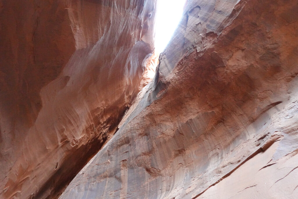 The beginning of the road to the Burr Trail is paved and beautiful. We had been told by the Hole in the Wall Visitor Center Ranger about a small slot canyon at the 12 mile mark on the trail. This part of the road was well paved with easy driving. The slot canyon was close to the road and was definitely worth the visit. Beautiful!!! – About 35 miles in, the road immediately turned to dirt, stone, rocks, dips, wash-outs, boulders, and every other road hazard you can imagine. Might not be a difficult drive for a 4 wheeler or jeep but definitely not for a low clearance Mini cooper convertible…. Knowing we had been advised and had read that it was passable in a passenger car we thought it might just be bad in this short section…