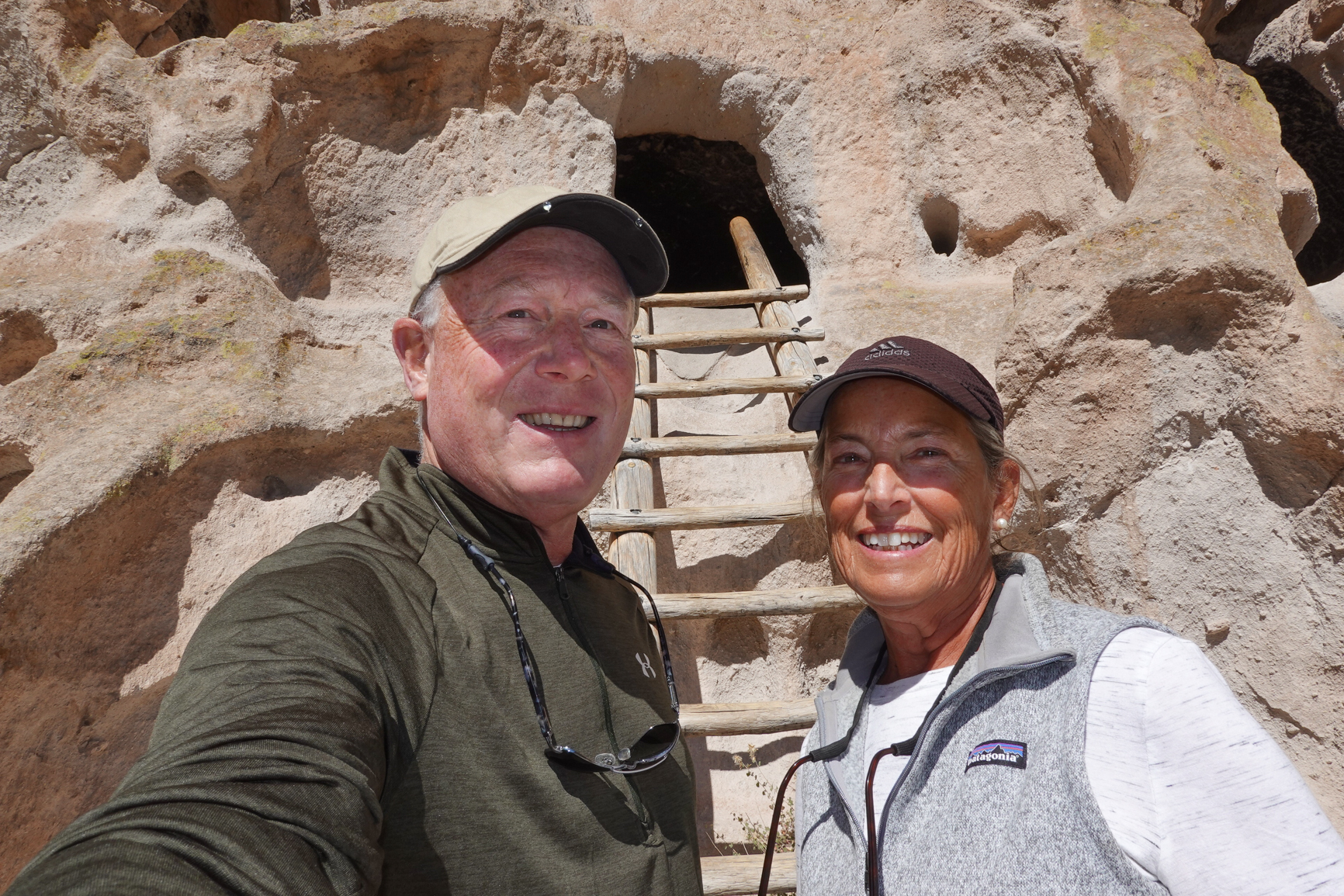 We hit the visitors center first to “get the lay of the land”. First step: passport stamp! Then into the visitors center to get some history. They only allow one family in at a time but the wait was short and reading about the people that made this area their home so many years ago is fascinating. Joanne had tagged two short hikes that seem interesting and should be able to fit in to the afternoon. We talk about these with the ranger and she describes the hikes in a little more detail. The Pueblo Loop Trail is an easy walk (mostly paved) that takes you through the canyon and past a Pueblo and some cliff dwellings which you can climb into the crevices using a ladder like the natives did. This was awesome! If you choose to hike an extra .5 mile farther you can get to Alcove House and climb up to it. The hike to it is easy but arriving where the ladders begin, we split off; Mike wanting to climb the ladders and Joanne not wanting to climb the ladders! Joanne climbed one leg of the three ladders but then decided it was not for her and waited for Mike to finish, take pics, and climb back down. This is an awesome hike that we would highly recommend! The ladders definitely not for those who are challenged by heights though…