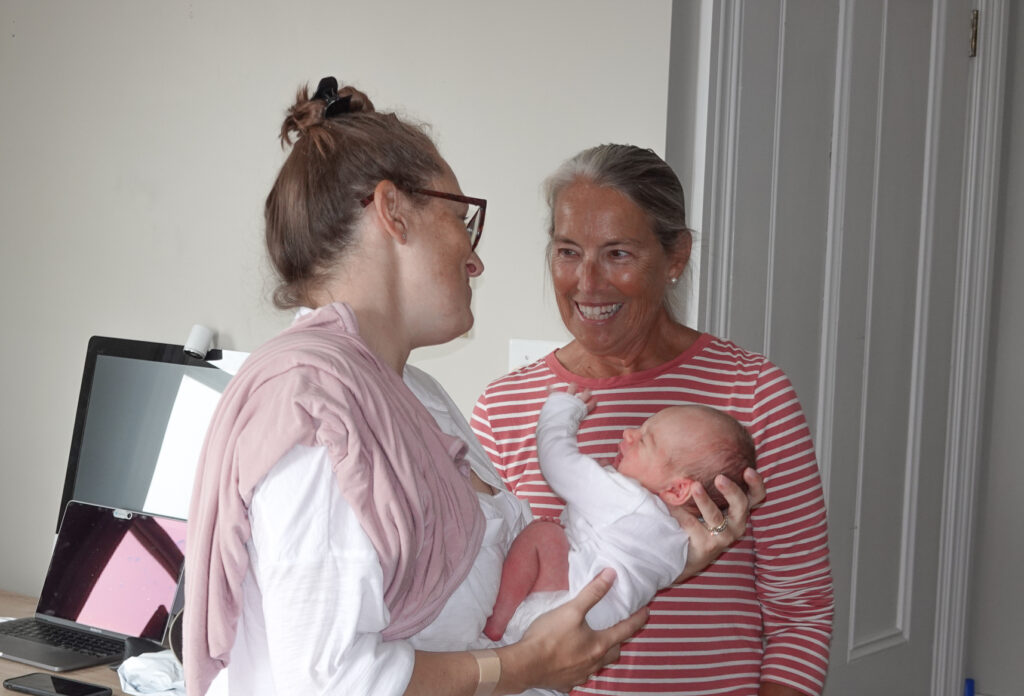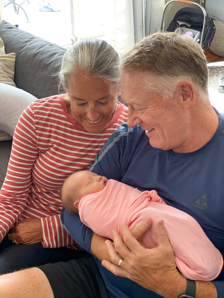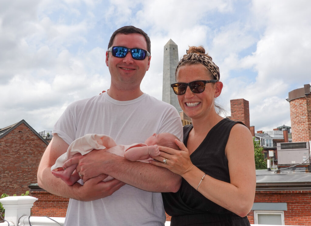 Not hearing anything for over 12 hours we finally texted Bruce. Apparently unbeknownst to us the baby had been born healthy and safe but Caitlin had developed some serious post delivery trauma that created a very stressful few hours for them. Our anticipation of the birth turned to genuine angst hoping our daughter was ok. Once Cait was stabilized (which seemed to many hours) the happy new parents texted us that everything was going to be ok and our first grandchild “Mackenzie Palmer Dew” had come into this world June 22. 2021. The”Mac”, as they call her, was here and because of the complications we needed to give them a few days of private time before heading down to see them and her. Although she had been born on Tuesday they stayed in the hospital a few days arriving home on Thursday after being discharged from MGH. We finally were able to visit on Friday. Those were some of the longest 4 days of this “Revolutionary Journey” I can remember. We were very excited to hold “The Mac” and and finally get to hug our daughter Cait after the very scary delivery challenge.