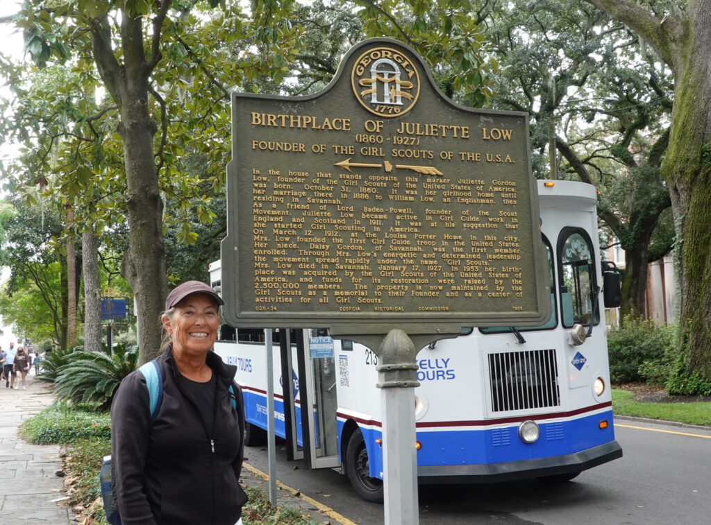We leave the campground in time to park, visit the welcome center, and walk the few blocks to get to the meet up at the Reynolds Statue. Savannah is different than Charleston; neither Mike nor I liked it as much but it is full of history for sure. We lucked out again with parking; parking at the welcome center where there is plenty of parking and is only $1.00 per hour. Luck would have it again, when we went to pay at the kiosk the sign said parking is free on Sundays and holidays. Today is Sunday!!