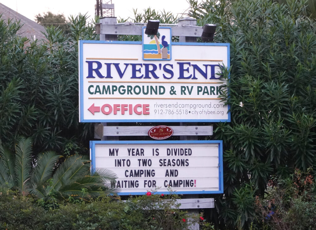 The drive to Tybee Island is easy from Savannah area and along the route we talk at length about what we will do during our stay there. Our campground reservation is at The Rivers End Campground. It is the only campground on the island and is owned by the county. We have a great site on the end so no one is next to us on our awning side. During the day there is some road noise (our site is right on the road) but by 8:00pm it is very quiet. There are camp hosts that guide you to your site and help you park. We met the Camphost/Maintenance person Roger on our arrival and became fast friends. After he discovered we had experience camphosting he brought the park manager by to meet us and they both encouraged us to apply for hosting in the future. Food for thought for sure….