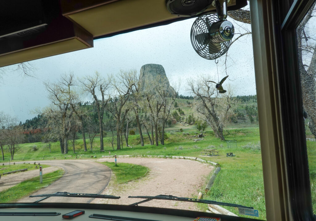We drive around a bit then decide on loop A site #10. There are actually many sites available so we have our pick of the park. This site is fairly level with a great view of Devil’s Tower out the front windshield! We had planned to arrive fairly early in the afternoon so we get some time at the Tower and Visitor’s center today as our stay here will be short. Since the weather continues to be iffy we take the car instead of walking the path. By the time we get to the tower visitor center it is raining and snowing again. Joanne gets her Passport Book stamped and we peruse the (small) visitor center. Because it is nasty outside, there is a tour bus group that has settled inside to eat lunch; this is annoying because the place is so small to begin with!