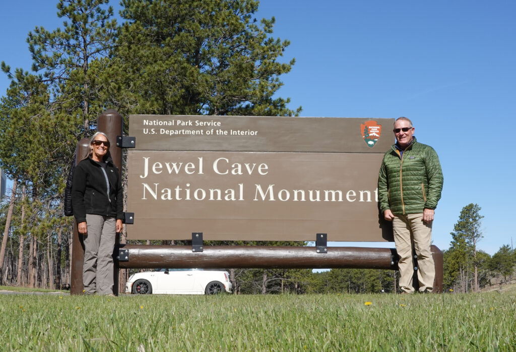 The cave begins with an elevator ride down but then there are still many stairs! The cave itself is more aesthetic, much wider, the access steps are better, and it is well lit. We are enjoying this cave so much more than Wind Cave yesterday. The tour lasts about 1 1/2 hours. The rooms and views inside this cave are huge and often breathtaking. It’s a wet cave and the tour is significantly more dramatic… On February 7, 1908 President Theodore Roosevelt declared, by proclamation, the cave as a National Monument. Jewel Cave National Monument is currently the fourth longest cave in the world, with over 215.0o miles of mapped passageways. (Note they are still discovering passageways and rooms every year here… ) Research done with changes in pressurization in the cave based on Herb and Jan Conn’s findings indicates that 215 miles accounts for less than 5% of the entire expanse of Jewel Cave. WOW!!!!