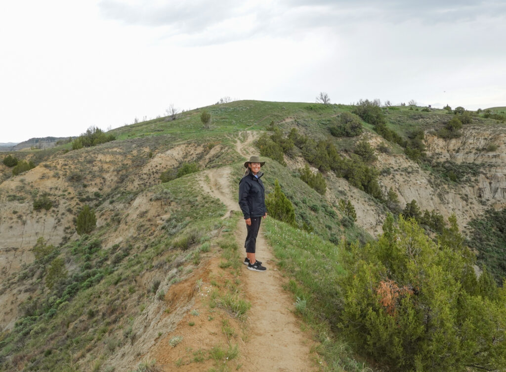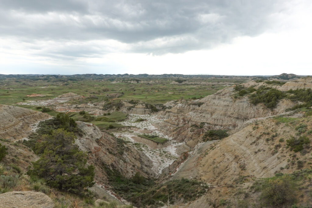 Today the weather is iffy so we opt for the visitor center and driving the scenic loop road (except part of the loop is closed so it will be an out and back drive!). It ends up being a great day! The video in the visitor center is great. Theodore Roosevelt National Park is a habitat for bison, elk and prairie dogs. It is comprised of 3 distinct sections, all linked by the Little Missouri River. The park is known for the South sections’s colorful Painted Canyon. Along the loop road/trail there are pull outs for views that allow us to get a good feel for the park. The loop trail is very picturesque. We see some bison and lots of prairie dogs. When finished we get back to camp and get the propane fire pit going for a bit of time before we head inside for dinner. It pours all night and we think we may have to cancel our plan to hike for tomorrow 🙁