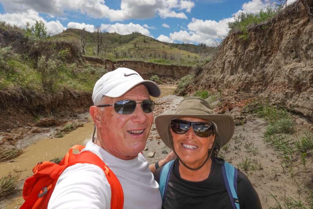 As we wake up the sun is shining brightly and there is no call for rain for the day so we are thinking maybe the hike will be a go! The only challenge will be the 5 or so stream crossings we will have to navigate. We gather our hiking supplies and hit the trail! When we get to the trailhead there are two families coming off the trail. Both comment on how muddy it is and some areas are just about impassable. But we decide to give it a go anyway and start out. The entire trail (Jones Creek Trail) traverses one of the wilderness areas beginning at the loop road near our campground and ending at the other end of the loop road where the road has been closed. If we make it there and back the total will be just over 7 miles. That is a good length of hike for us both. It is a beautiful day for a hike and we enjoy it even though there are some challenging parts because of the many mud/wet ares plus the stream crossings being so high. But we are able to “bushwhack” our way through any areas that are too muddy and some we just walk through anyway! The stream crossings we pretty much have to create our own way across then find our way back on to the trail. But it is fun and we get some laughs in! At two points we have to walk through prairie dog “towns” and we can hear and see the little guys barking and warning each other that human’s are coming through! We make it all the way to the other side and begin our way back. We comment that the way back is always faster than the first half!