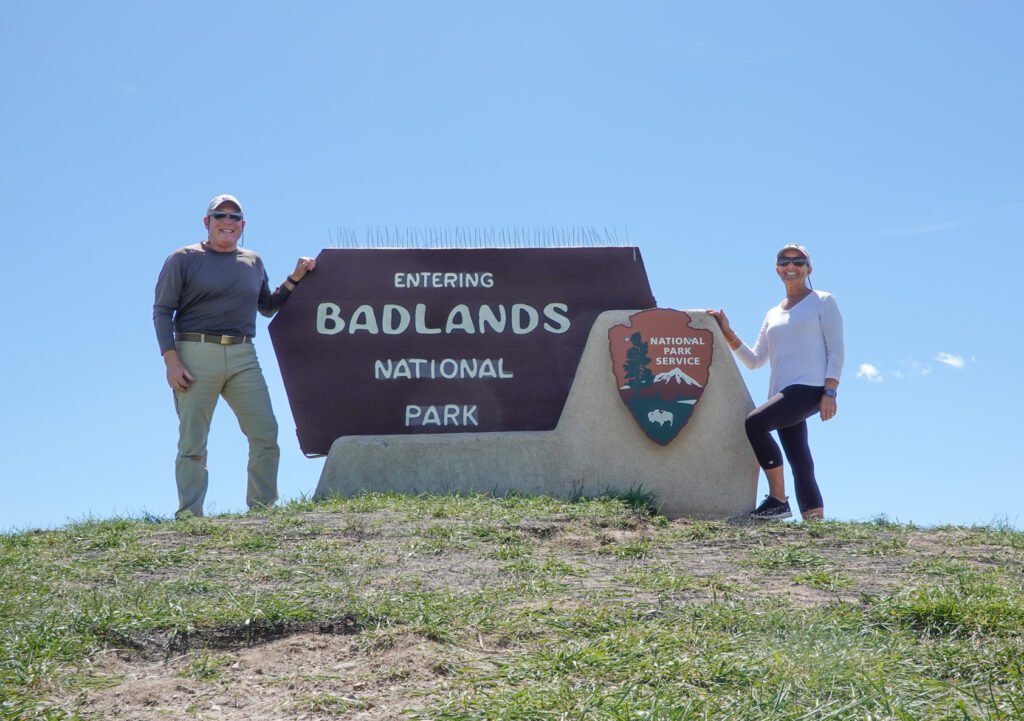 We have really enjoyed our short time in Wyoming driving West-East including the Black hills and Devil’s Tower area though today we are headed to South Dakota…. we have reservations for five nights, with no hook ups, so it’s pretty important we find a dump station and potable water to fill our tanks before setting up there. They do have some water spigots to fill jugs we have but we still have to dump and take on water. The nights have been cold and we have burned more propane than ever on this trip. We find propane at Flying J in Rapid City. Because it is Sunday, it is a little more difficult to find dump and potable water. Mike asks the propane filling guy for some recommendations and he says there is a dump station in the back. (Pretty well hidden for sure). Tanks are empty and water is located at an adjacent Cabela’s across the street by the the dog kennels located in their parking lot. (We definitely have become pretty resourceful over the years…. Back on the road and it isn’t far to the campground.
