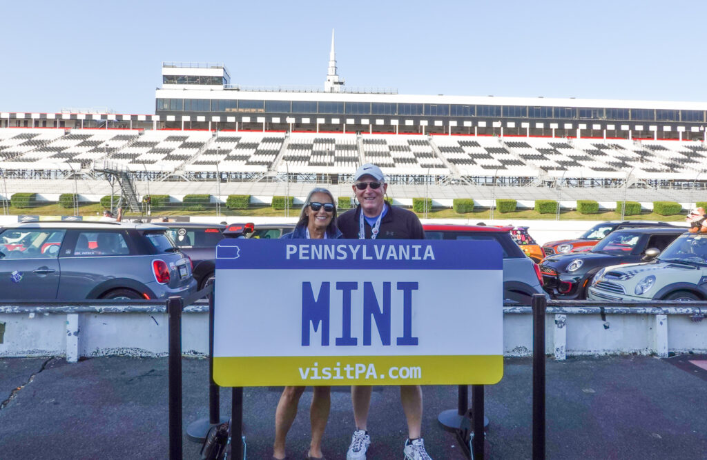 We arrive at the rise and rally location which is the Pocono Speedway! Before we line up we get to drive half the track!! So fun!! We do the usual; breakfast (Bacon / egg and cheese biscuit- fruit & juice), get the drive route, our magnets and pins, Mike gets a pin for his hat and we get some photo’s at the photo opportunity stations. Then it is time to drive out! Again we get to drive a lap around the track, under the tunnel and then out. It’s very cool to see so many MINI Coopers all driving one behind the other! This usually lasts for a few miles before we get split up by traffic lights or other drivers that get between us…
