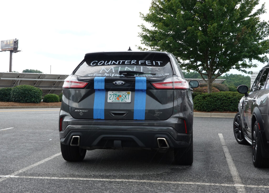 Today begins the rally! We arrive shortly after 7am to find many folks already lined up! There are lots of tents set up and people there to flag / guide us into place. It is so fun to see so many interestingly wrapped cars. We get to the gathering area and get our magnets, pins, and drive route…. People are getting reacquainted with folks they have met at other rallies. There is music playing and someone on the mic getting us all organized and psyched up for the day… This morning’s breakfast is pancakes, sausage, and juice. We do look over the merchandise, for sale, but decide we don’t need any T shirts, beverage glasses or other “souvenirs” . We get our breakfast and mill around the cars to see what others have done to make their car unique.