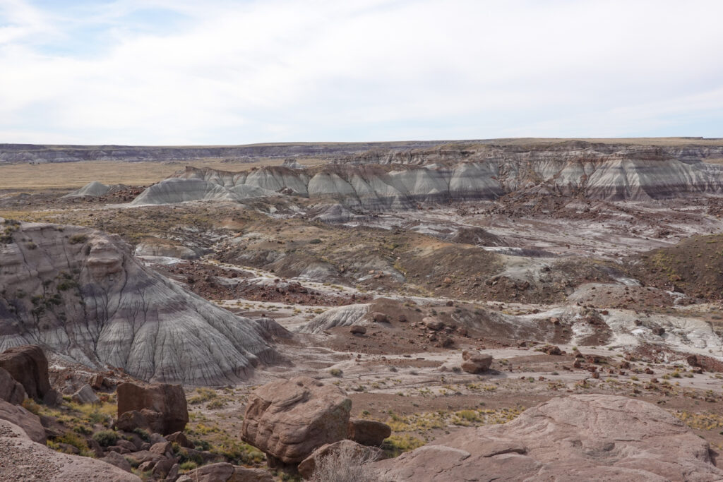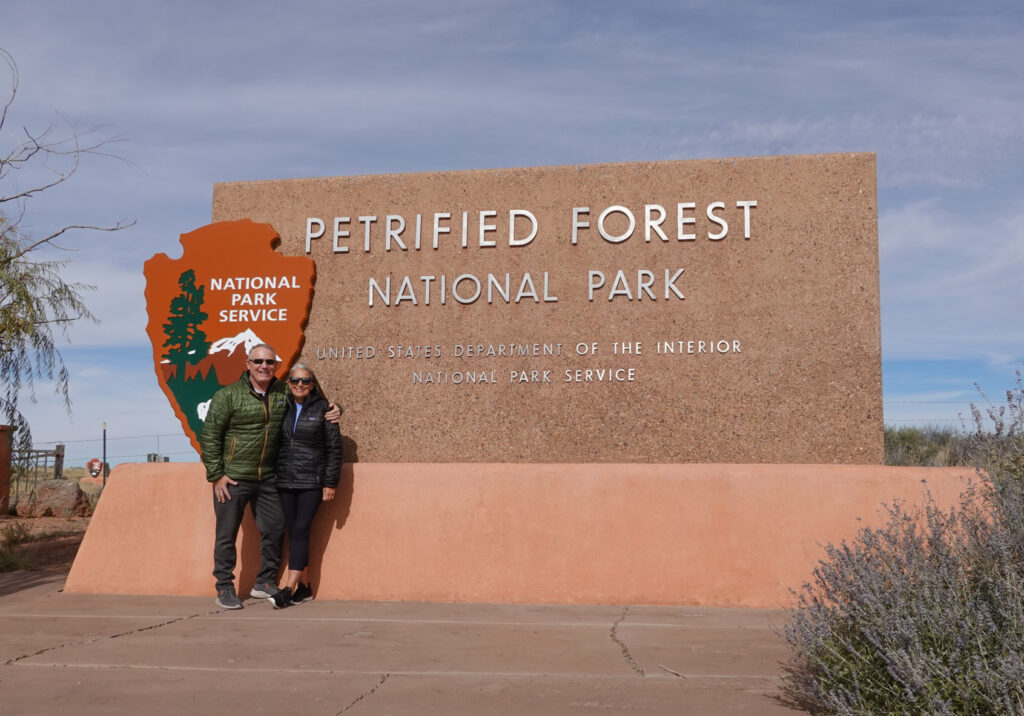 We crossed the border into Arizona today and spend several hours driving through and visiting Petrified Forest National Park. This is out first visit here and because the roads are wide we can actually drive through the park with the tow car attached making many scenic stops along the way. The geography is diverse and definitely unique in this park.