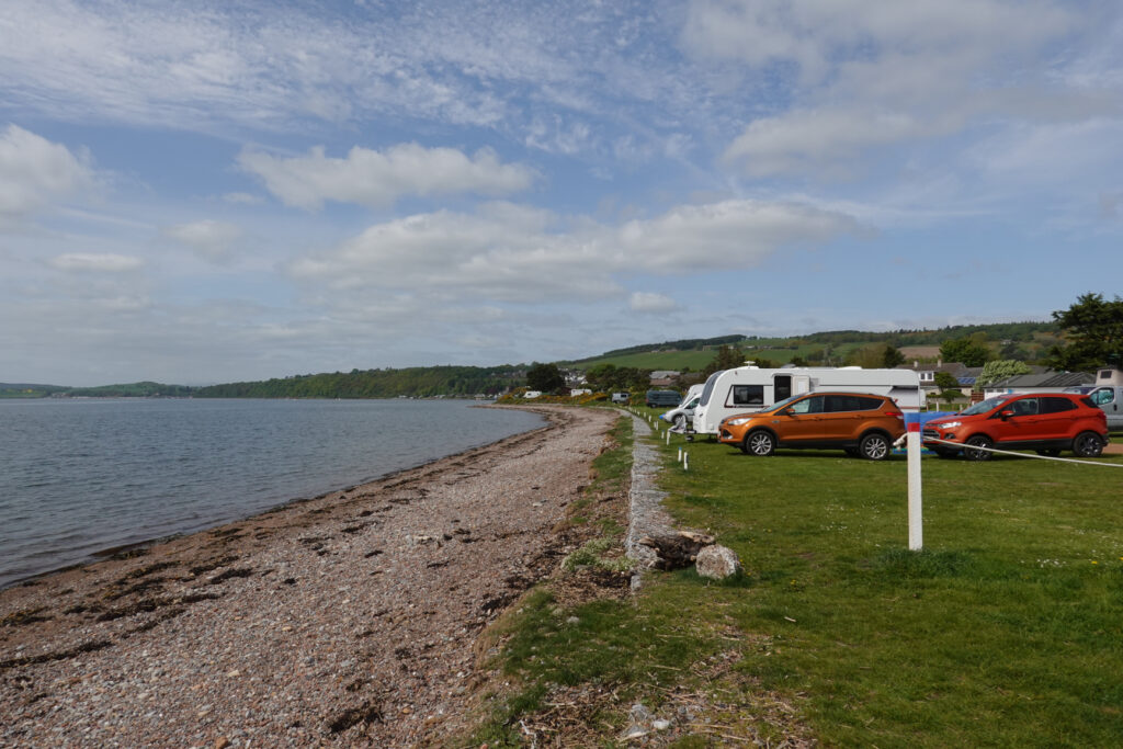 In plans for today we knew we still wanted to try and see dolphins in Fortrose, visit Urguhart Castle, and possibly Clava Cairns. We had a late night last night at Gellions so got a later start this morning with sleeping in. The day looks spectacular with bright sunshine and warmer than usual. We head to Fortrose but have to figure out how to get to some waterfront. We find ourselves at Fortrose Bay Campsite! Campground right on the bay! There is a spot to park and walk a bit but with Mike’s leg needing to rest we park and just view the water hoping for dolphins; but never do see any. But we were still happy to have found this place.