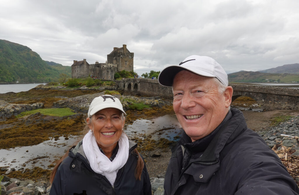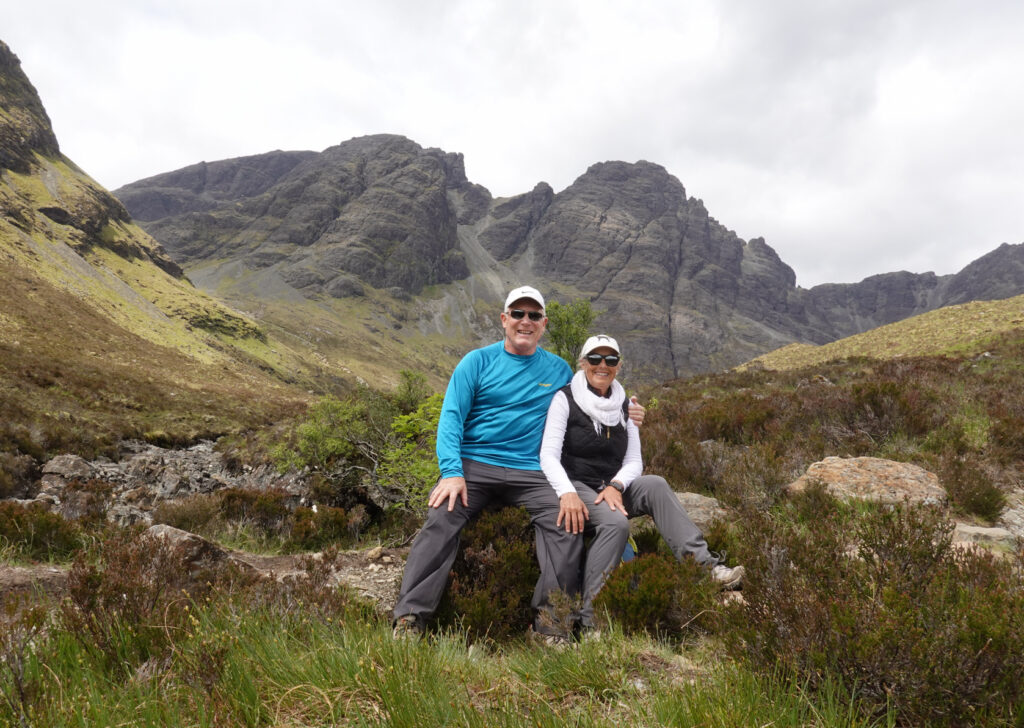 Mike decided then to take a walk down the stream bed to get a moment to collect his thoughts. Serendipitously he looked down in the stream bed and found a huge flat rock that he thought he could use as a fulcrum if he could get it back to the car. To this day we have know idea how he lifted that rock up and carried it up the stream bed to the cars front tire. Must have been total adrenaline strength, especially on his only 60-day new hip replacement. He slid it under the front tire and then jammed a large rock under its center. Again have no idea how that got accomplished. He then put all his weight on the end and saw it slightly lift the wheel. He next gave the motorcyclist instructions to stand on the end of the rock and when he got in the car and was ready he said “jump”. The motorcyclist’s weight was enough to lift the car just enough that when at the same time Mike popped the clutch the car was able to lurch forward out of the stream bed. Joanne yelled stop but Mike new that the rear end was now in the hole and chose to ignore her and just hope the forward momentum with his foot on the accelerator would propel the car enough forward to get the rear tire to escape the hole as well. To this day, it is without question, except to say it was literally our Scottish Miracle we escaped that catastrophe in the remote area of Isle of Skye…… Everyone was literally astonished we got out of the hole with no damage, including Mike, as he excited the car. . We were extremely (I repeat EXTREMELY) LUCKY! We will never forget this experience…
