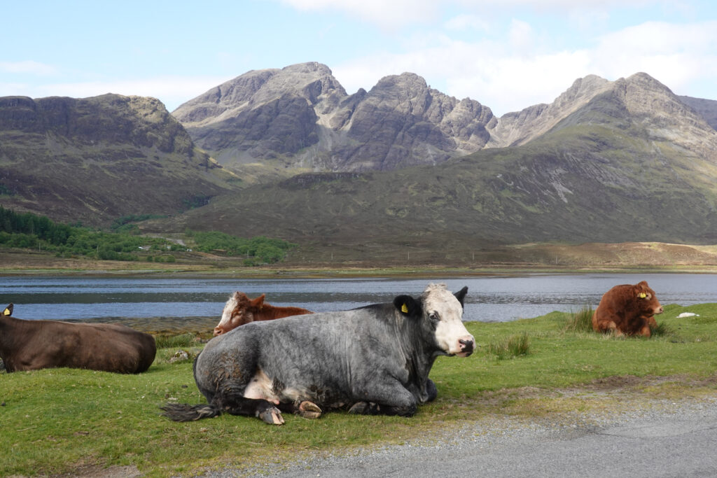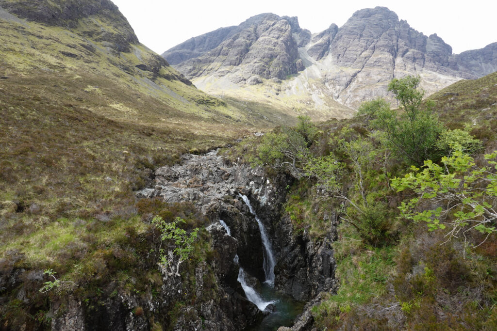 Our last full day on Isle of Skye. Kate had showed us on the map how to get to a more remote hiking trail following a stream and leading to several waterfalls. The road in is single track and full of pot holes. As we were trying to find the parking spot we passed by many sheep on the road and a herd of wild cows almost on the road. It was pretty crazy.