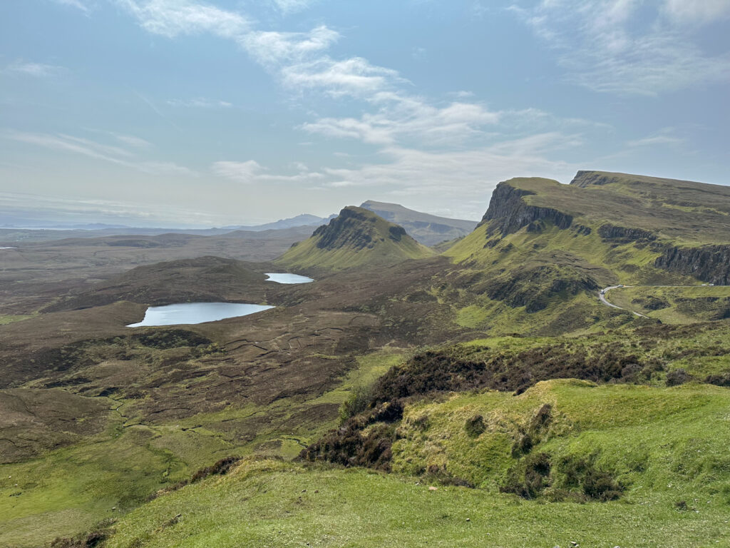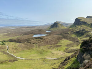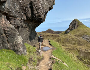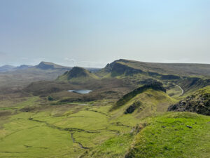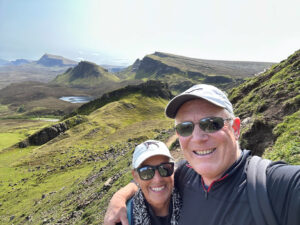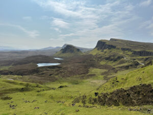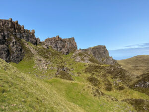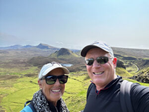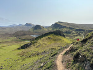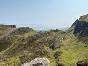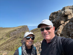 Since they were out of eggs yesterday and were expecting a delivery by 7 this morning, Mike headed out bright and early to fetch the eggs! On the way back in he got to talking with (our Air Bnb owner) and she told Mike- it’s such a gorgeous day you must hike Quiraing!! So off we started! The drive to the trail head is about 90 minutes with the last 20 minutes on single track, pot-hole filled roads! By the time we arrived (around 11:30) there was no parking available! But we were patient and eventually we were able to get a spot. We walked the most amazing, epic hike! The views were the most amazing! We captured lots of pics and spoke to some very nice people as we walked. The Quiraing Trail might be one of the most incredible hikes we have taken on this “Revolutionary Journey”! Pictures don’t do it justice. It is a wonder of nature…