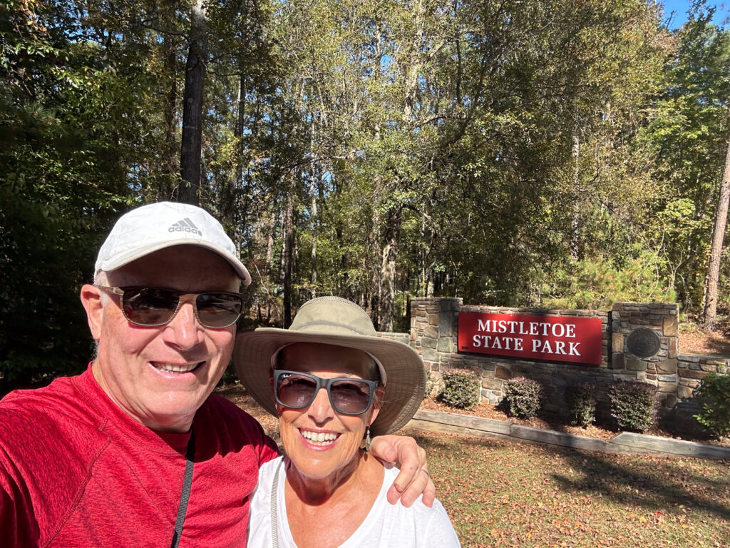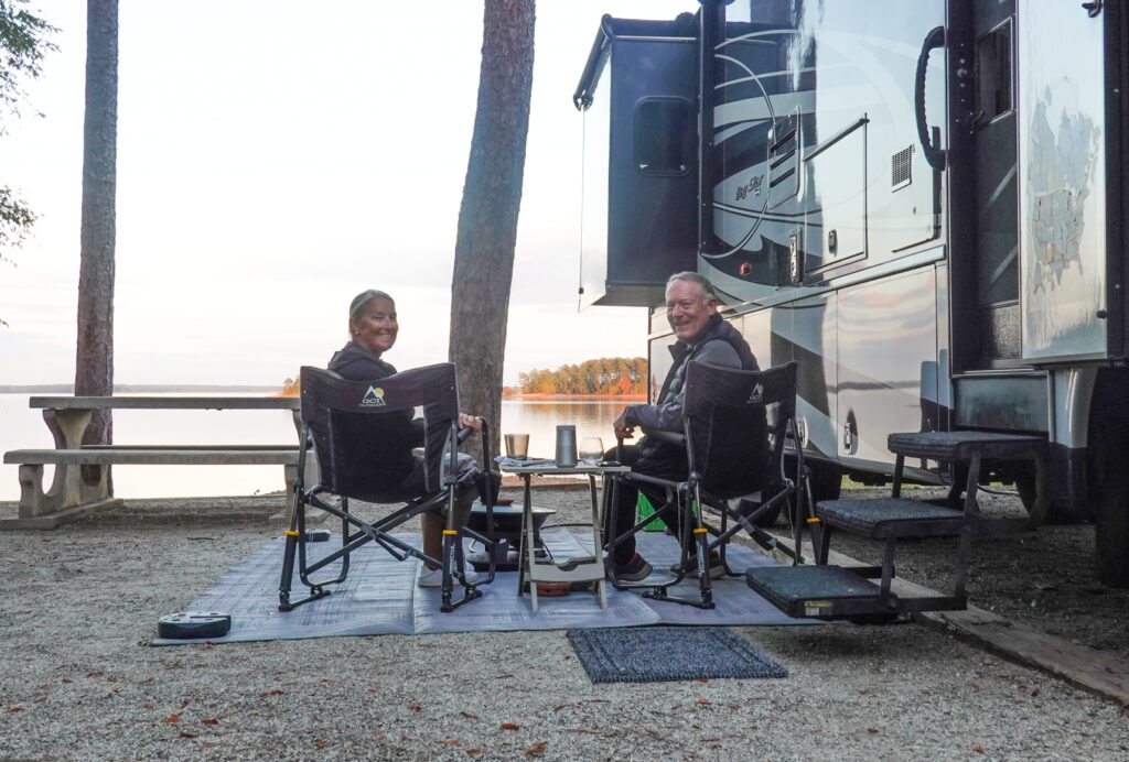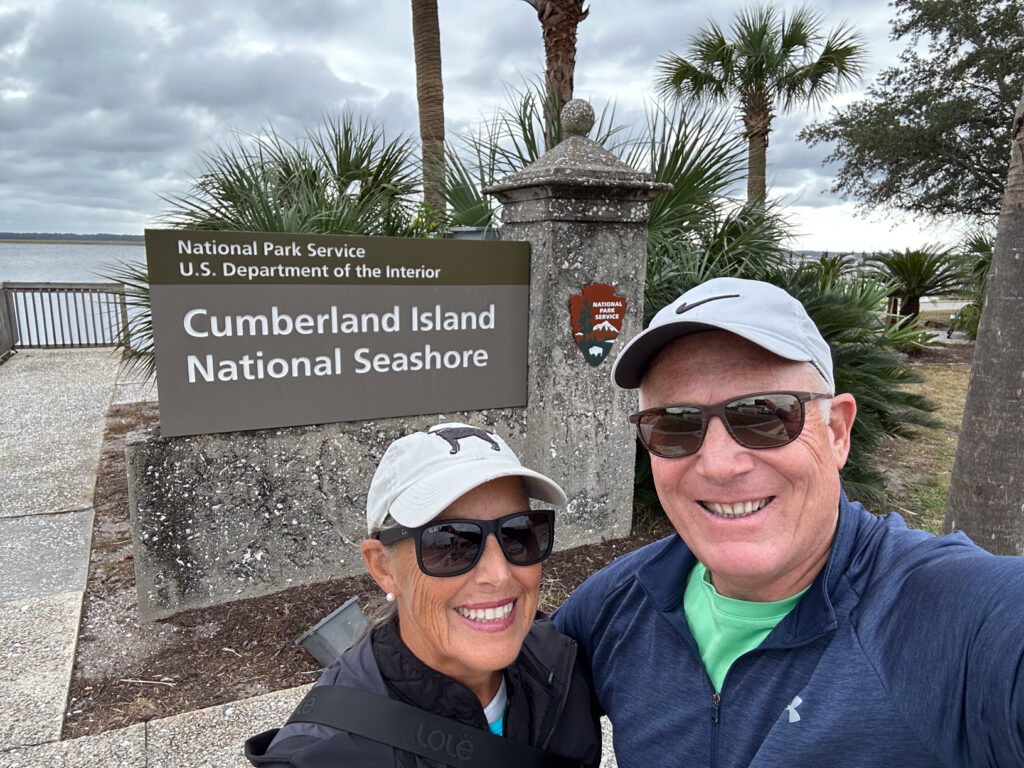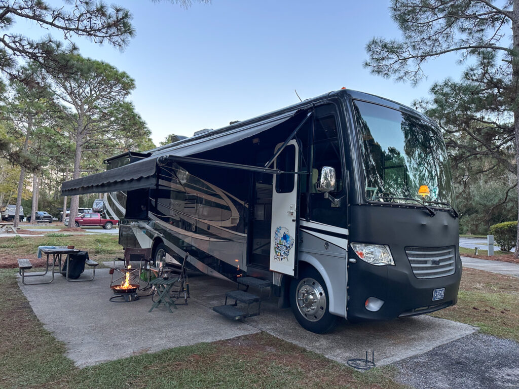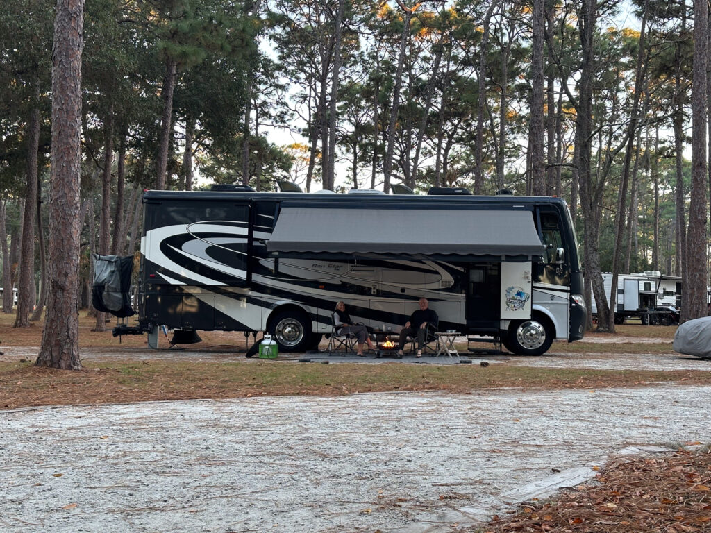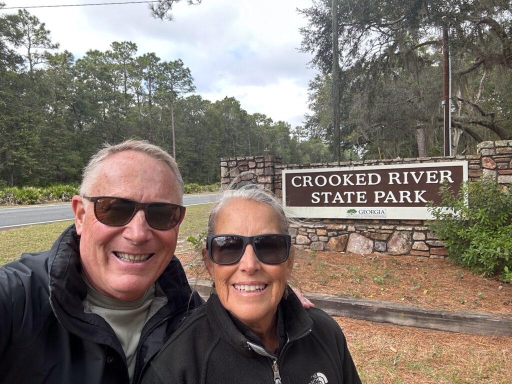 As we head out in the morning we dump but Mike had already filled the fresh water tank with water at our site (he wanted to disconnect the night before because it was supposed to get cold overnight).  We dump and hitch up with no problems and the drive is pretty easy. We find a Walmart Supercenter right on the way (easy in / easy out) and pick up a few things.  Though it’s not a stressful drive, it takes the bulk of the day and we find ourselves pulling in to Crooked River State Park in southeast Georgia around 4:00pm.  Both Deb & Tony and Steve & Debbie have stayed at this park and really enjoyed it. In addition many people we talked to at Mistletoe have stayed here and really liked it as well so we are looking forward to our stay here.  Although we don’t have a river view right from our site the campground looks nice and we look forward to exploring it over the next few days.  Our site is large, level and right in front of the bath house.   We set our chairs out and start the propane fire pit but it’s been a cold day and as soon as the sun goes down we end up inside for the night.  Joanne puts some salmon in the oven, mixes a salad together and we are good for the night.