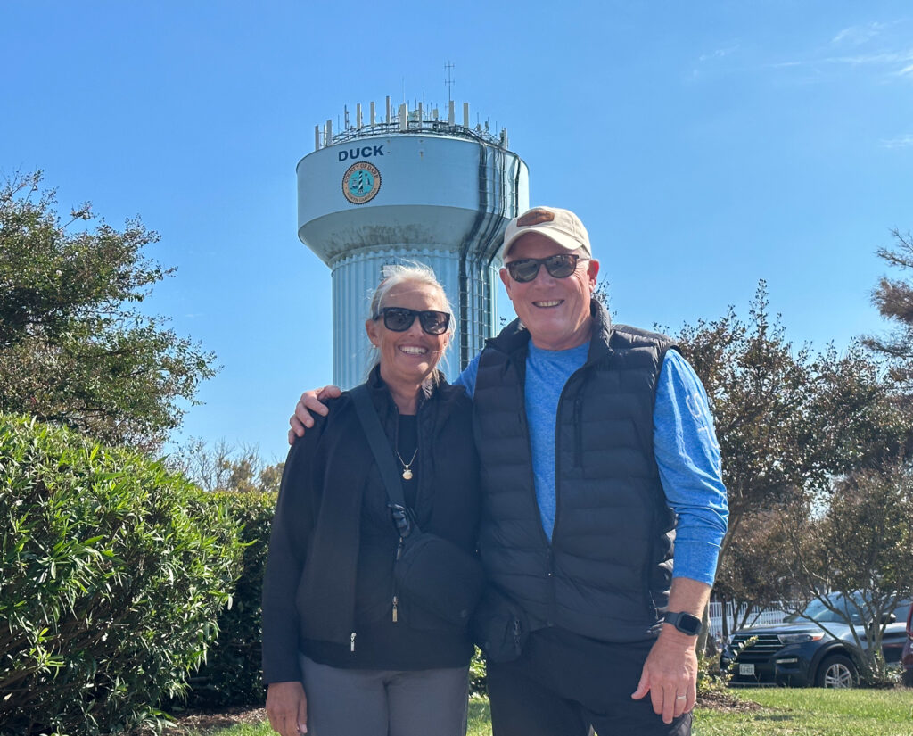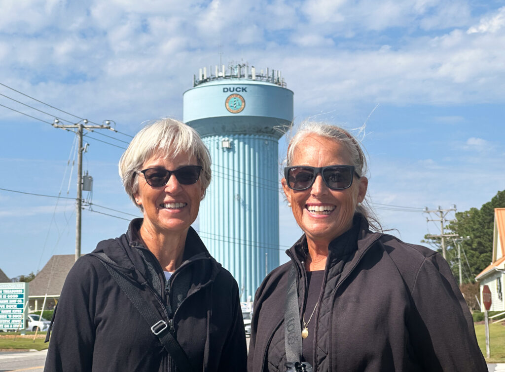 Second morning Deb and Tony are sad about having to leave the next day so look and find another electric site available, so they can stay an additional night. Once she reserves the site we take off for a drive to DUCK– a small town Steve had told us about. It’s about 40 minute drive to get there but we put the tops down and head out. Duck is in fact a very cute town and Deb was able to find a fish windsock that she didn’t already have at Kitty Hawk Kites.  After that we walk the boardwalk, along the water, and find a deli to get sandwiches and a convenient picnic table to eat at.  We get some pics then head home for Happy Hour, some Cajun chicken on the grill, and Cole Slaw.  The drive home is along the beach front houses and is a great break from the highway.  Where did so many people get so much money from????
