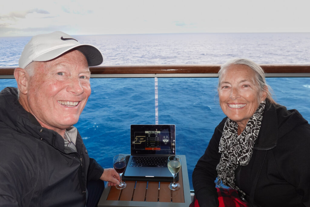 In 2023 we were sailing on the cruise and were able to watch UCONN win the 2023 NCAA Men’s Basketball Championship on the Big Screen. It was an exciting game and a perfect night under the stars watching basketball, Now 2024 an entire year later who could have predicted UCONN is again in the NCAA Championship game and we are again on a Princess cruise. We were so looking forward to watching the game again on the Outdoor ” Big Screen” but unfortunately they weren’t streaming it. UGH… We made several inquiries on the ship tried to find a location somewhere’s to watch with no success. Last resort we headed to our balcony room and were able to stream it live on Joanne’s IPAD. The upgrade by Princess to StarLink connectivity this year which was included in our cruise package saved the evening. The internet is FAST, reliable and worked perfectly. AND UCONN cut down the nets again!!!