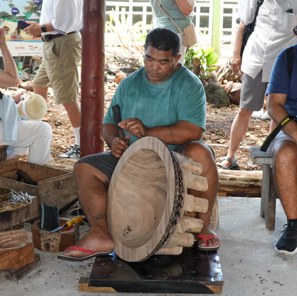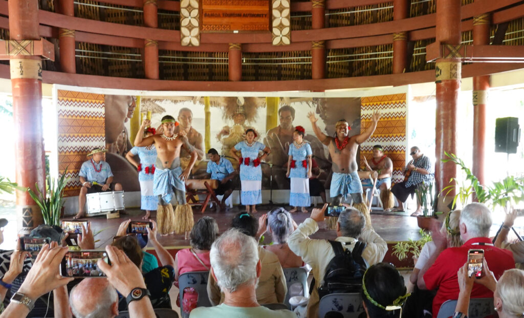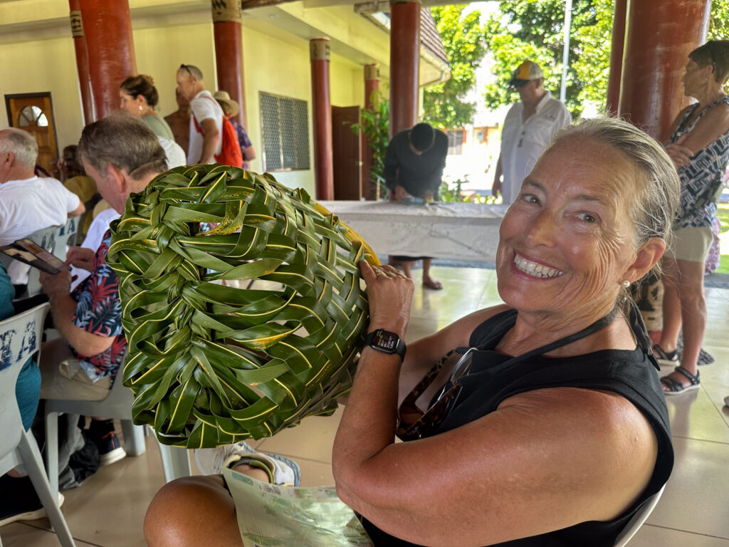 At this point with all the changes in setting the clocks back plus the crossing of the International Date Line I’m not really even sure what date it actually is!  But I’m writing about the day we are in Apia Western Samoa.  The docking is beautiful with a group of native chanters on the dock to welcome us to their country.  We had decided not to arrange for a ship excursion for this port knowing we could walk into town, the cultural center and some other areas of interest.  As we get off the ship we head to the right. Because Mike has had a bad head cold we are going to find some NyQuil along our path today. But as we walk along the streets and through town we see that is not a realistic thought!  We do stop into a very primitive market and also into a pharmacy but no way they would have anything like that. We decide to look on the ship when we return.  We do find the cultural center and decide to make arrangements to attend the 10:30 show.  The cost is 20 Tala (their currency) so will need to hit up the ATM to get some!  That is easy and we get probably the last two seats for the show. It is very crowded and they do not limit the number of tickets they sell so there are many people standing and it is very difficult to see much.  If you have the opportunity, try to get closer to the front,  where you can see some basket weaving and other crafts they make.  From the beginning of the show they move us to another section of the property where they demonstrate cooking over an open fire.  With the crowd this is pretty much a nightmare!  It is crowded and already super hot weather wise and then add the open fire and smoke and it is very unpleasant. But we manage to see bits and pieces through people that are standing closer.  Next up is a Atwood carving demonstration. This does get disrupted by a woman passing out (probably from the heat) and so we see and hear very little of that part of the program.  The last section was the most enjoyable with dancing and singing.  Then they passed out some of the food they had cooked.  All in all worth the small amount of money we paid.  Afterwards we took some pictures and headed back to the ship hoping to come across the Robert Louis Stevenson museum or the Marine preserve.  We never find the museum and the preserve looked too primitive so we skipped it. Happy to be back on the ship for some food and a swim!  We are refreshed and enjoy the departure; though it is an hour late as we await the return of 3 guests that we don’t think ever made it make on board!