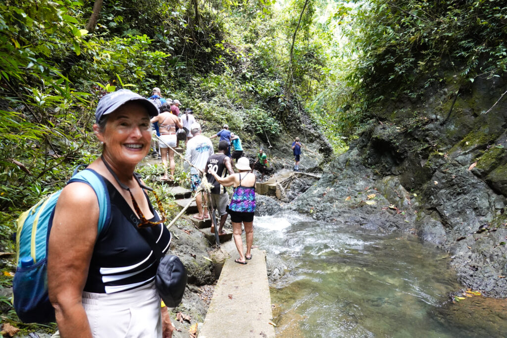 Once at the river head we get into swim suits (changing area very primitive) and get life jackets on. We will be traveling in long boats to a path leading to a waterfall. The river is called Anaconda River (to Anaconda Falls) because the movie Anaconda was filmed here.  The boat ride is nice; we see the area and landscapes.  When we get to some shallow rapids we pull up to a piece of land to walk to the other side where the boat will pick us up again bc the motor is not strong enough to make it though the rapids with all of us in it!  We are beginning to realize that some of the people on this excursion should not be on it!  But all of the guides are very accommodating and helpful, giving a hand to those that have mobility issues or carrying backpacks that are heavy.  We both wore our trail runners but many chose to wear flip flops which have to be difficult to navigate in.