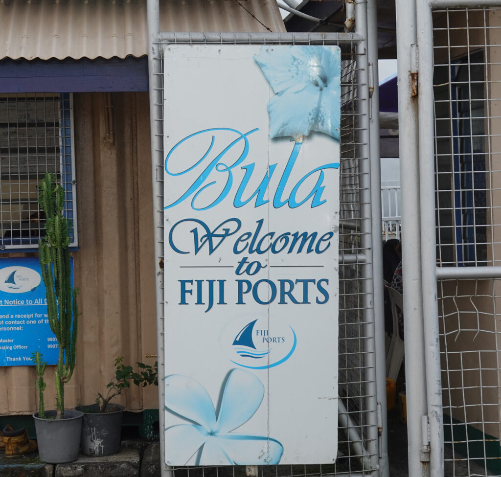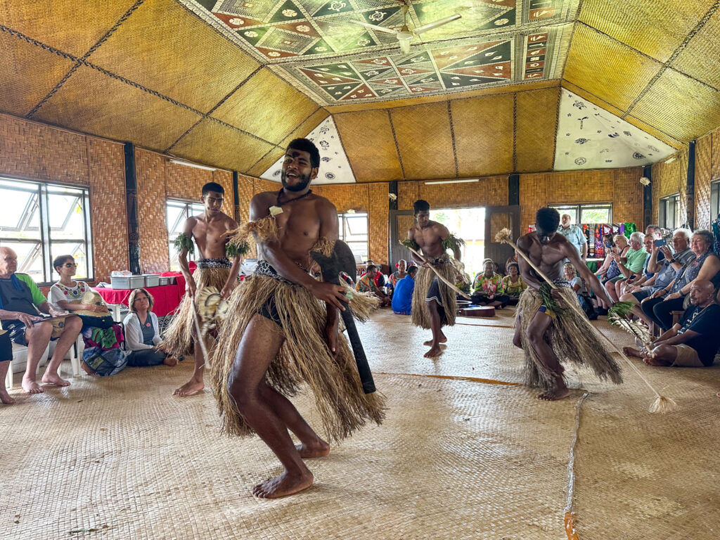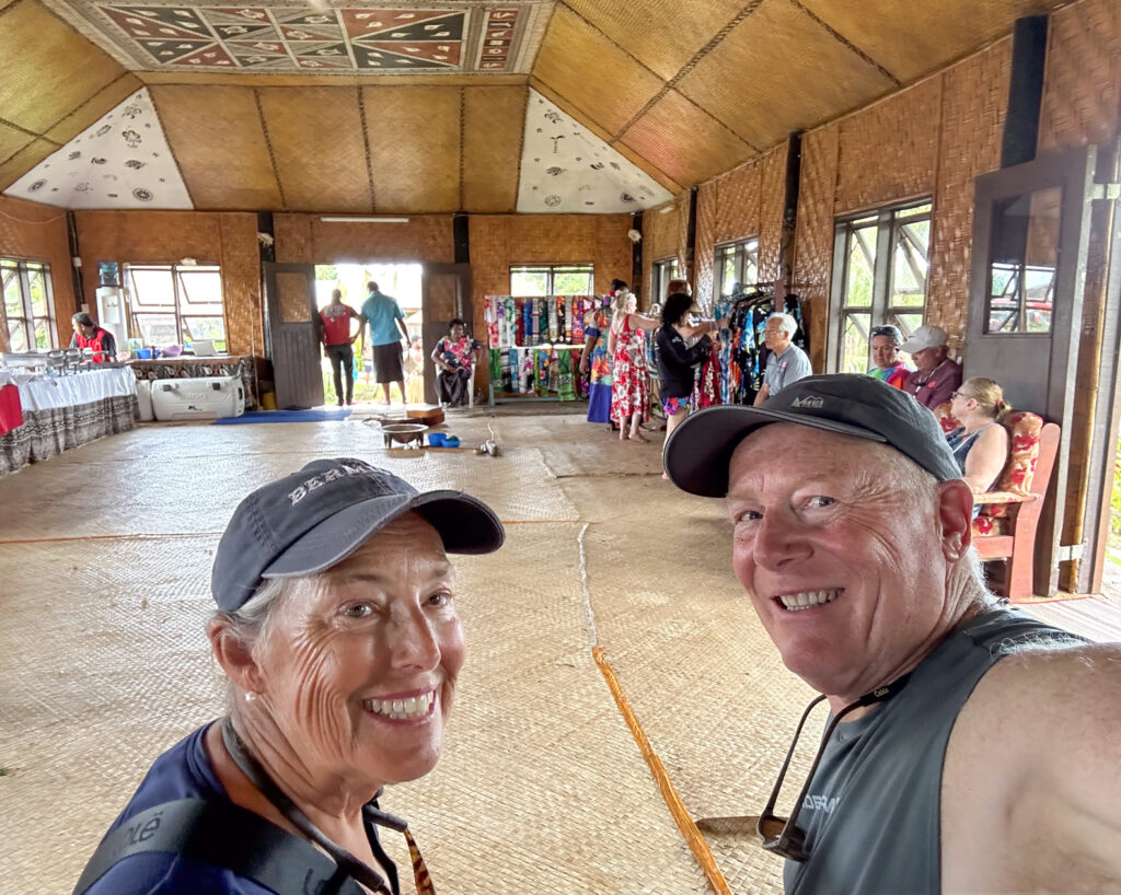 This morning we get up early to watch the ship pull in to port. We have an early / long excursion so we get breakfast and head to The Wheelhouse to wait to be called to the bus.  Everything is pretty well organized (considering it is a very primitive island!). Suva is the big city but we get bussed about an hour from the cruise port to a village on a river. There are two full bus loads of us for this excursion.  The guide on our bus gives pretty good commentary of the area / island and its people.  Mike is (of course) named our chief of the day.  We learn three words; Bula (hello or any good salutation), Vinaka (Thank you), and (Good Bye).
