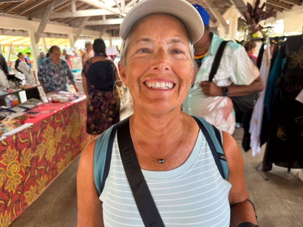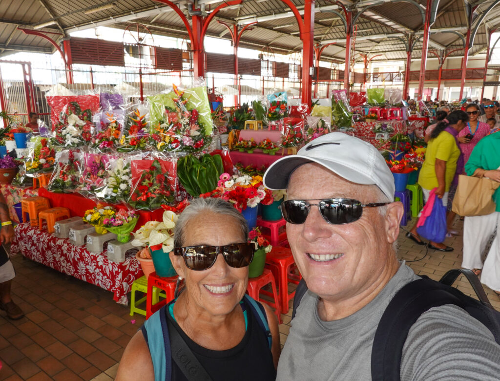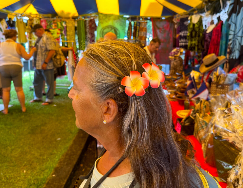 As we headed in to find the food and craft market (Chris was looking to buy some black Tahitian pearls).  This is only a short walk from the ship and was fun to wander through and check out the wares.  Joanne finds two flower clips for herself and we find a little solar hula dancer for Mac.