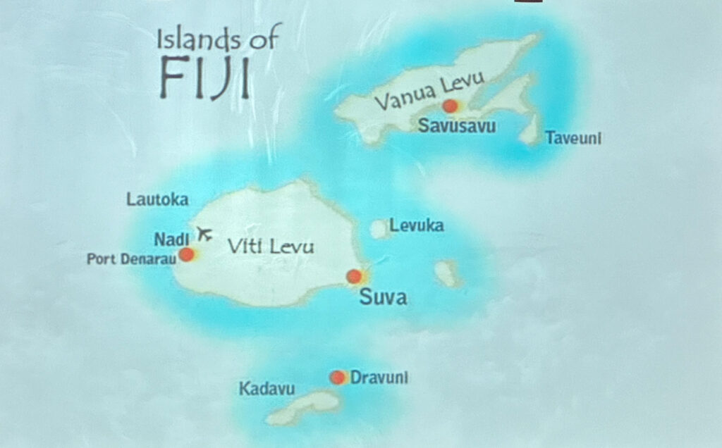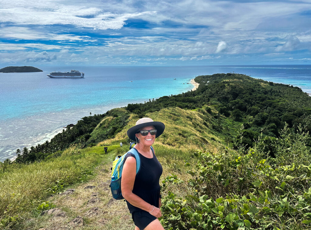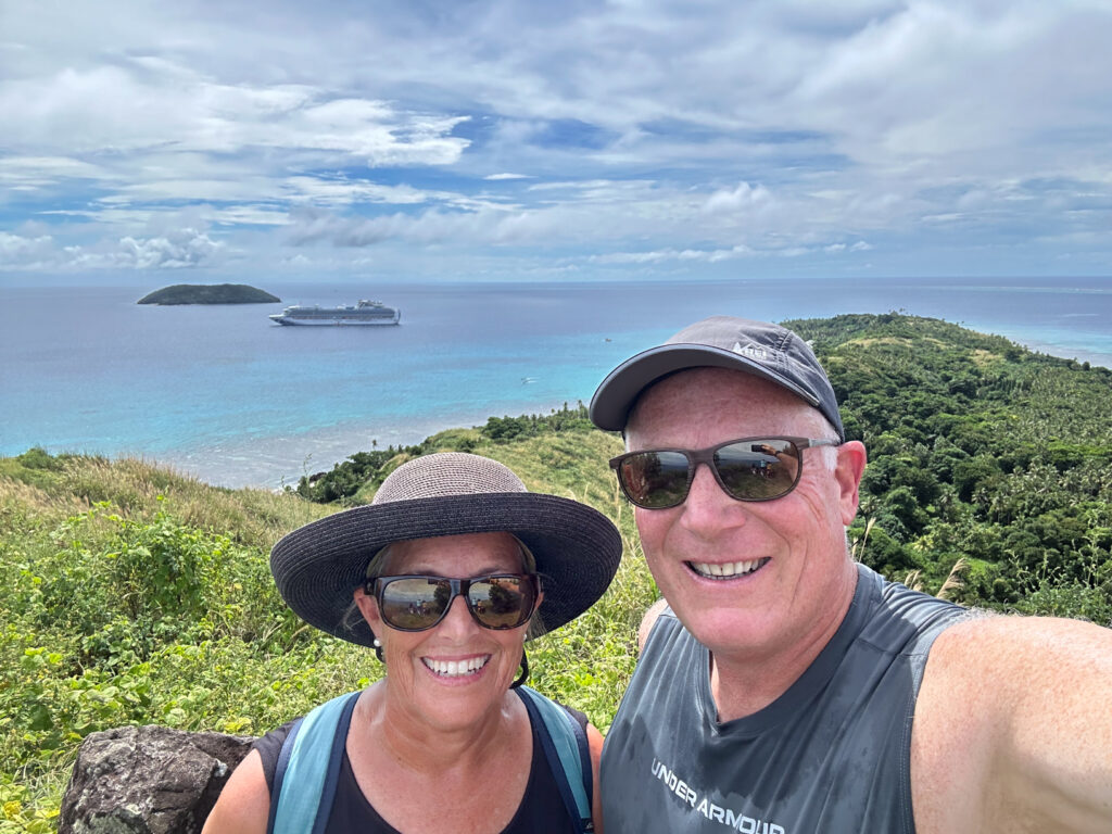 This should be a pretty relaxing day on the island with not much there.  This island is known to our ship’s staff as Gillian’s Island because it is so primitive and small. There is a village where we dock but only about 200 inhabitants on the island.  It is very primitive. The villagers are very nice but there is nothing Mike or I need to purchase there. We take a walk to the top of the highest point to get a great 360 degree view of the entire area. BEAUTIFUL!  But it is hot and the climb up is fairly steep. Combine the two and we are sweltering!  We get back to the bottom and Joanne gets into her swimsuit to cool off in the beautiful waters of Figi.  We get a nice, refreshing swim and then get on the line to get the tender back to the ship. We find out as we are on line that a man got into so trouble while he was snorkeling and two Fijians had to pull him out, do CPR on him. They transported him back to the ship but the Doctor onboard couldn’t help so they actually had a helicopter come onto the island for him.  Very scary thought! This is a reminder that you need travel medical evacuation insurance…
