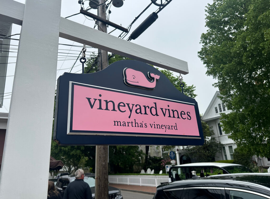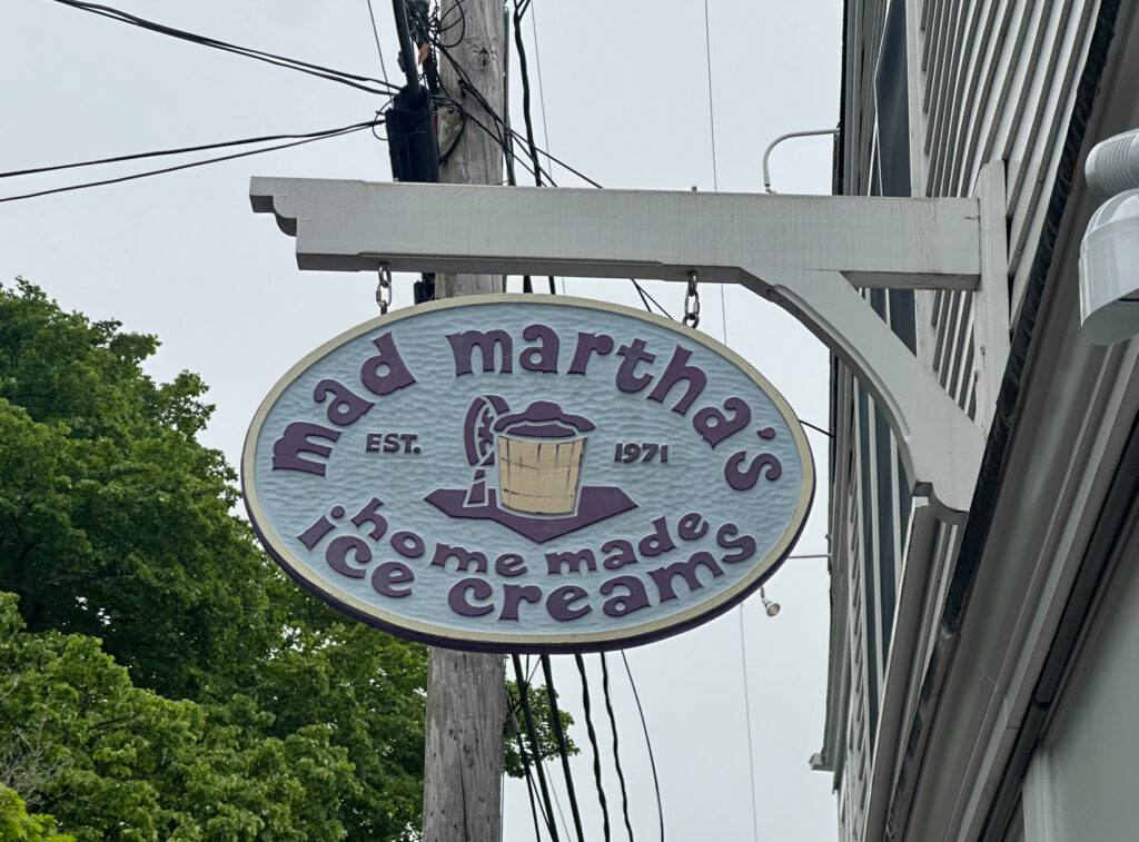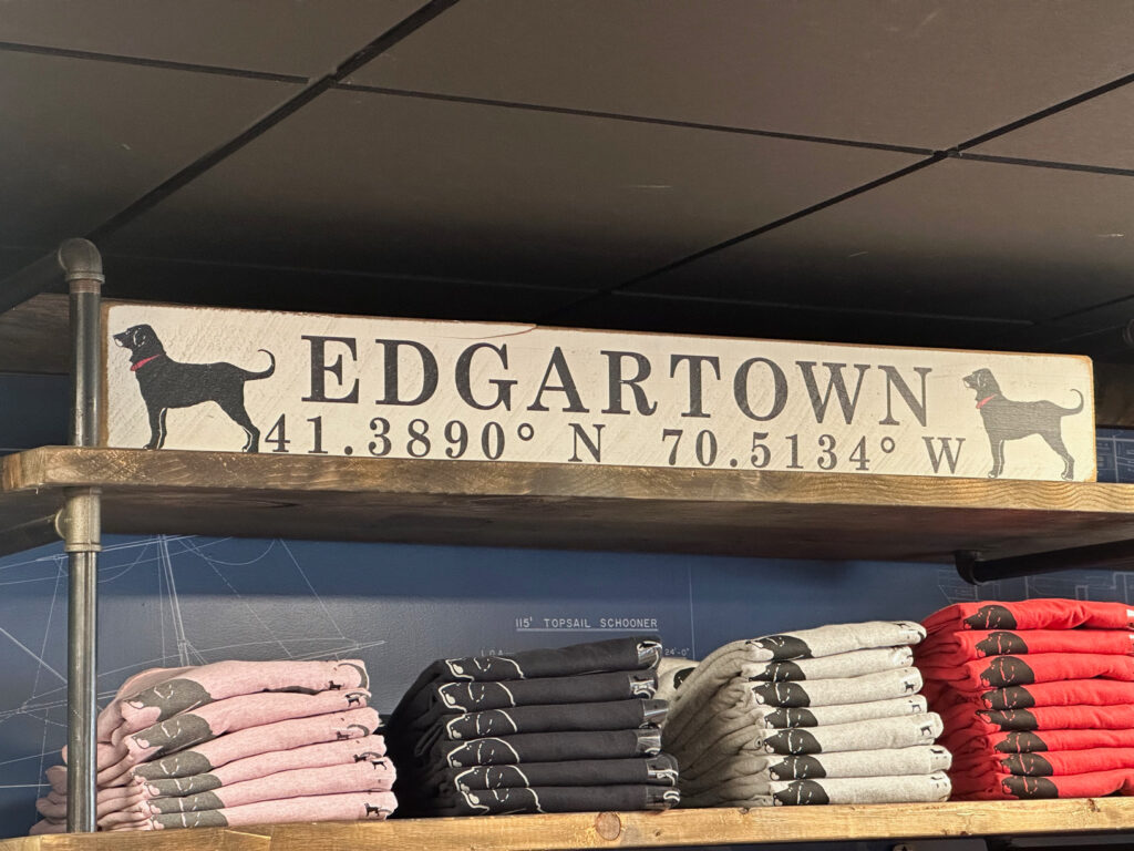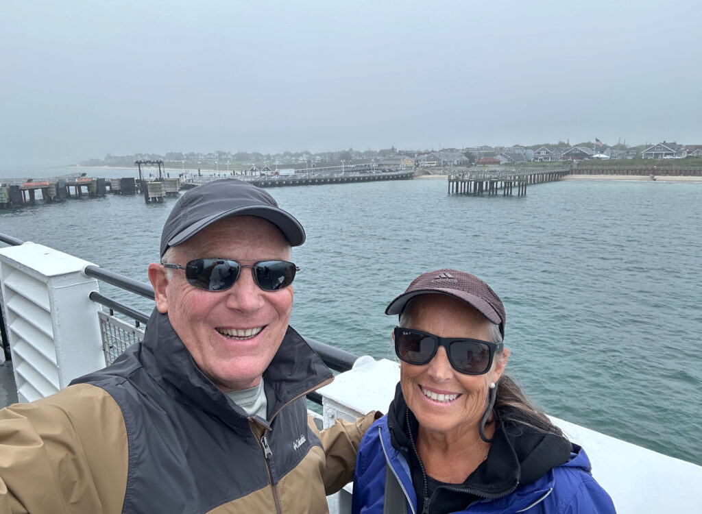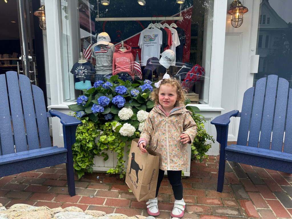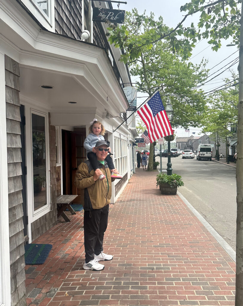 On Tuesday of our visit Caitlin & Bruce had a work day on the phones so Gram & Pop decided to take a trip off island into the town of Edgartown, MA. Joanne and I have visited Edgartown many times over the years and remember walking the streets of this famous town even when Caitlin was a toddler. Edgartown, MA was made especially famous back in the 1970’s with Steve Spielberg’s Movie classic “Jaws”. Crossing from Chappy too Edgartown we walked on the “On-Time Ferry”  for the couple minute boat ride across the mouth of the port. Once there we spent several hours walking the streets, visiting the stores, and reflecting with Mac.