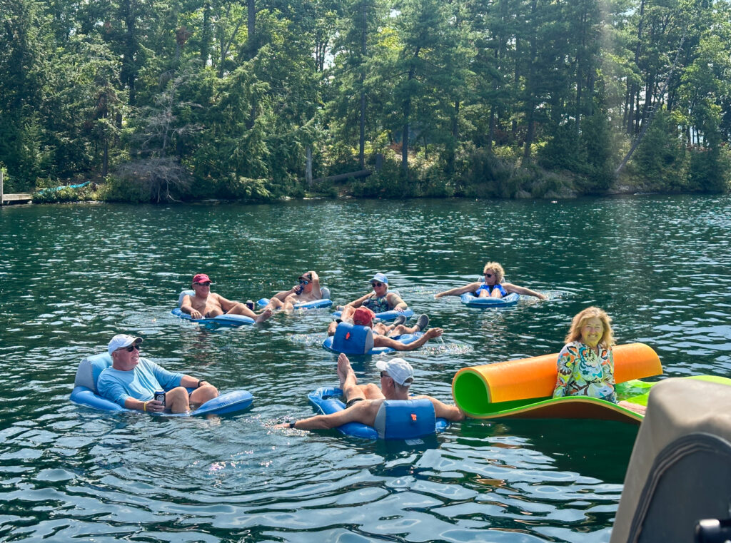 We enjoyed lunch on the back deck, cruising the lake, tying boats together to just float on tubes during the afternoon, and then dinner on the deck again. So many stories to reminisce about, catching up on our adult lives and families, and a toast to a few gone brothers like Dr. J… Mike was really glad we made the time to go and reconnect with so many friends from our college days!