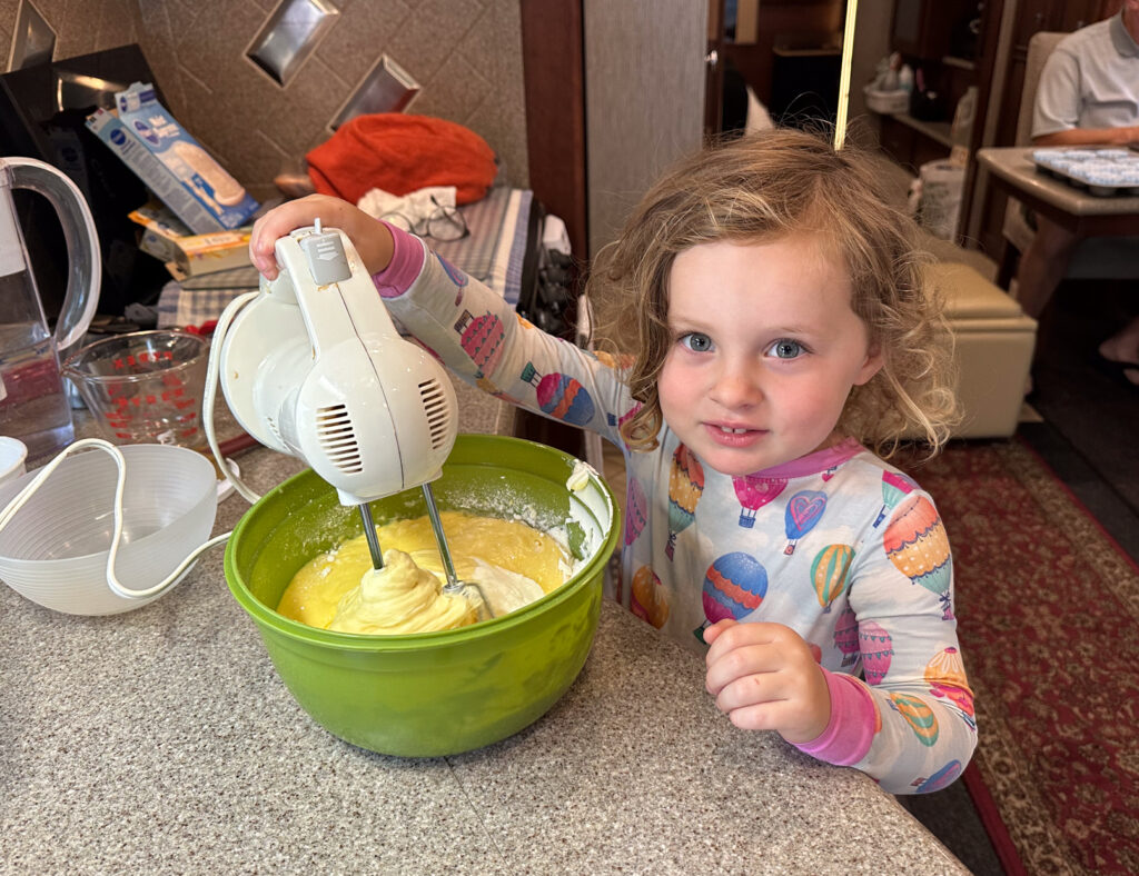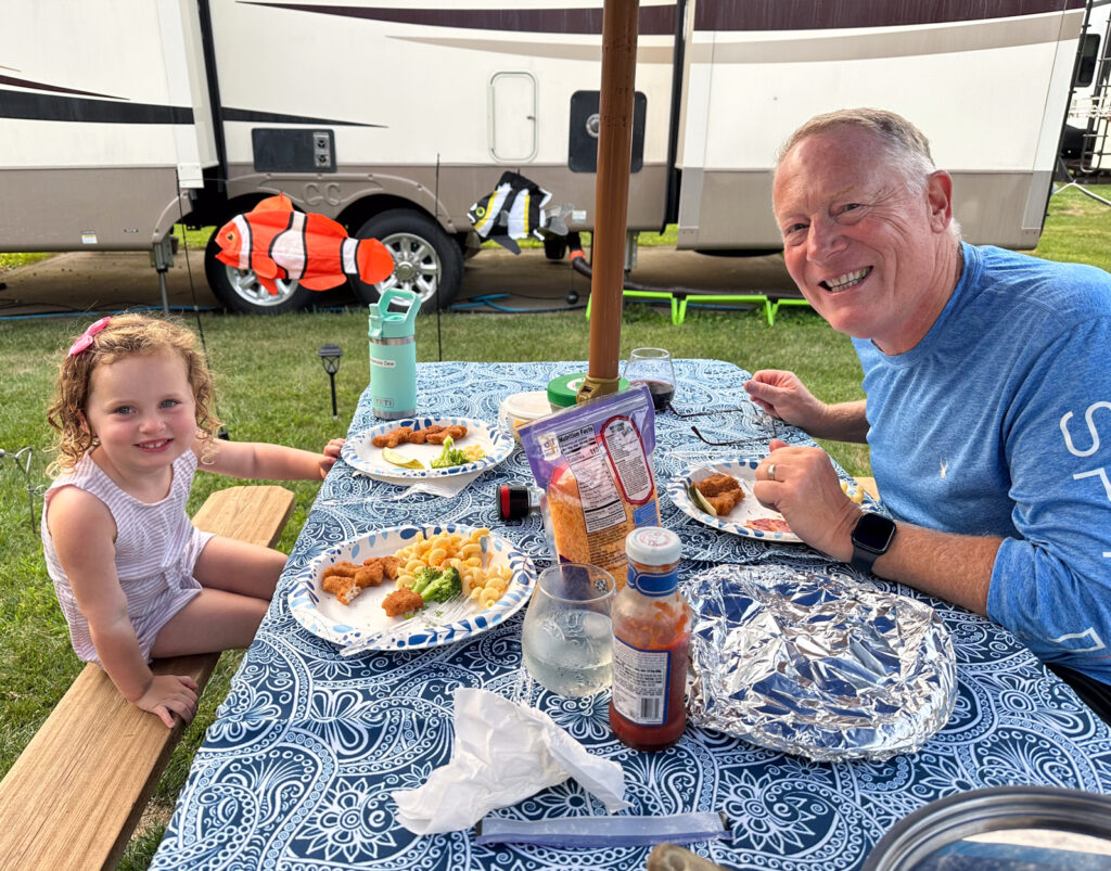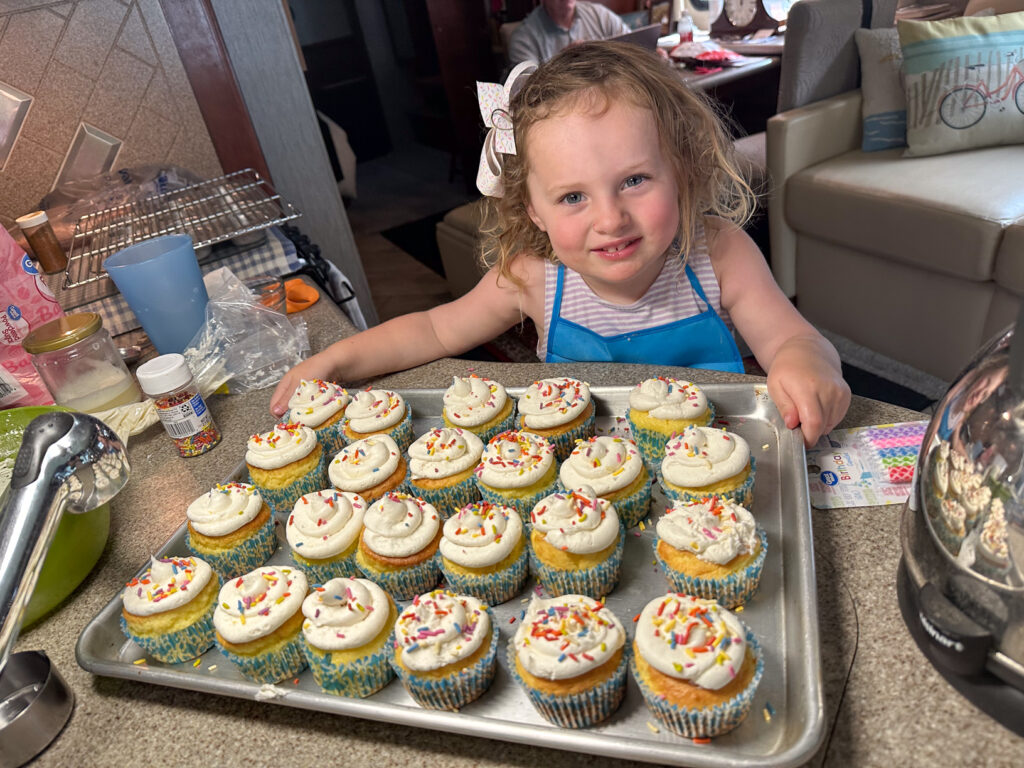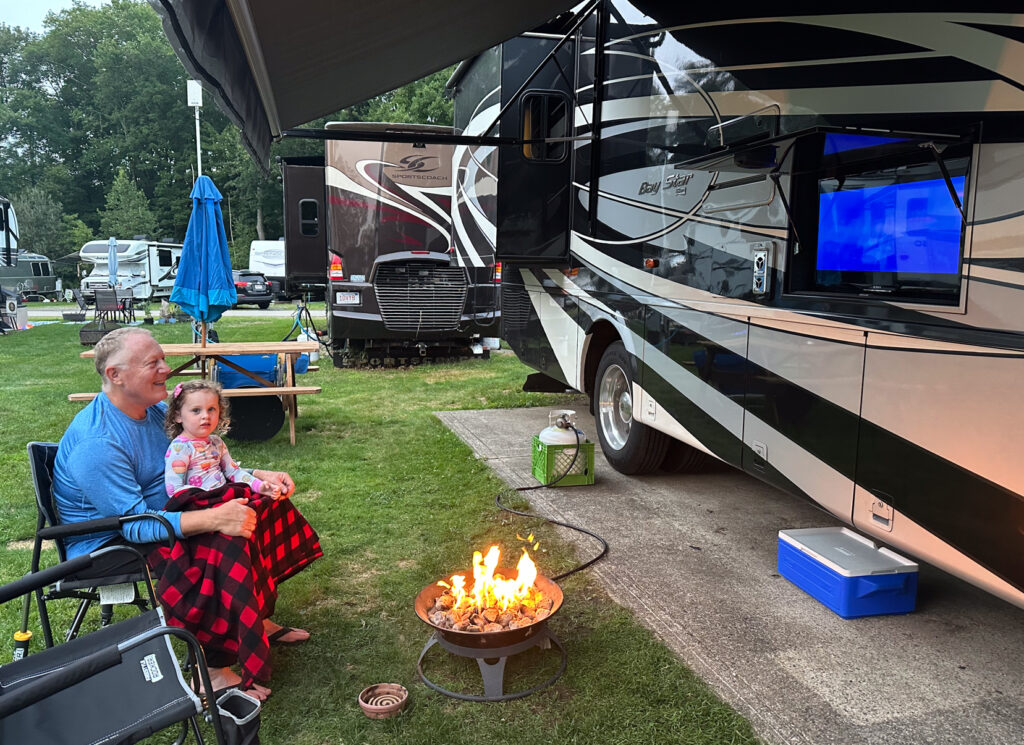 This year our granddaughter turned 3 years old and we had the opportunity to have her camp with us for nearly 2 weeks while visiting Massachusetts and then again CT on our way south. Gram (Joanne) & Pop (Mike) were definitely in our glory and exhausted after these next 2 weeks. Mac has a lot of energy (I mean A LOT of ENERGY!) We got to bike ride, swim, bake, have campfires, have movie nights on the outside TV, playgrounds, go to the beach, visit some farms, and… It was a BLAST for sure and we are so fortunate to have this time and have the trust of our daughter and son-in-law to get to do this!!
