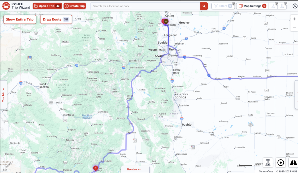Departing Pagosa Springs, Colorado had us heading East and then North the entire day. We are heading to visit our son, Sean for a few days in Loveland, Colorado. He has recently relocated back to Colorado from North Carolina and we are so looking forward to seeing his new home and getting a visit in. Our plan is to stay at “Boyd Lake State Park” . The drive has us crossing 4 different Colorado passes today beginning with Wolf Creek Pass being the first. We have driven through Wolf Creek Pass before and it’s a beautiful drive, though it’s a steep one for sure.