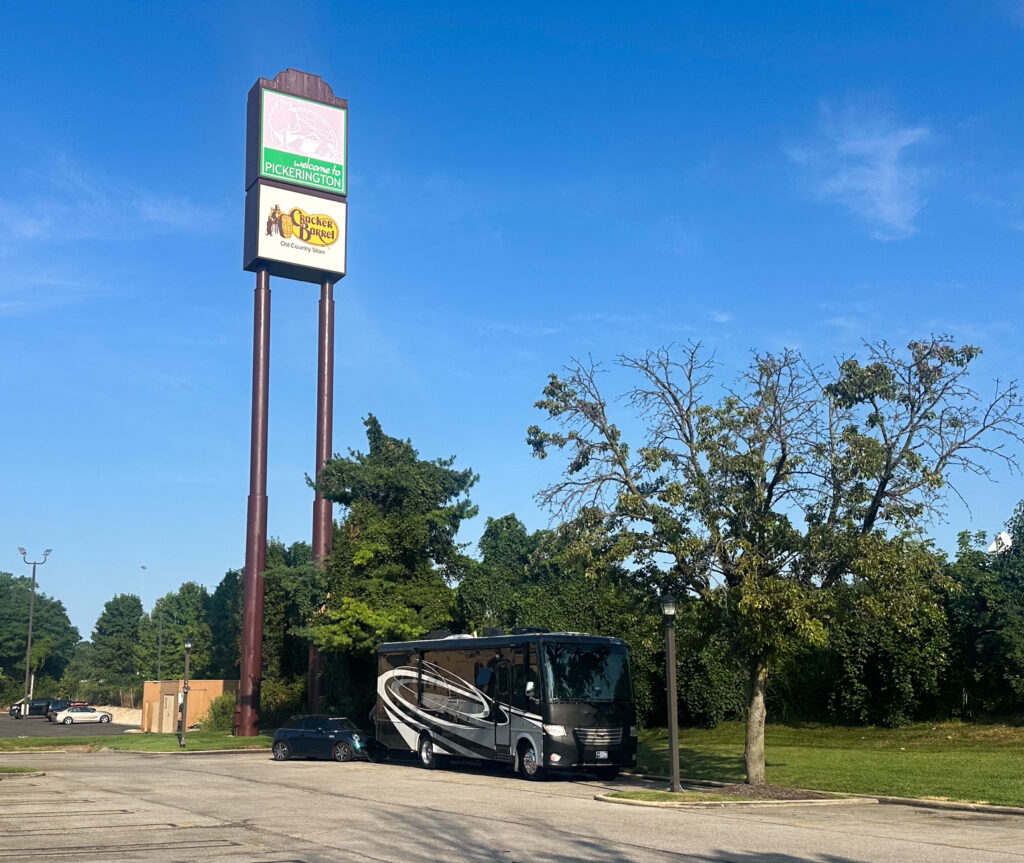 When we are driving from point A-B like this we often stay at conveniently located “Cracker Barrel” restaurants over night. Joanne uses the “Cracker Barrel” app to locate these highway adjacent stops and often confirm access, distance from the highway, reviews, and parking availability through additional apps like “RV Parky” and “Google Maps”. She’s been doing this for years as navigator while I’m driving. It’s a team effort and we have it pretty dialed in. We prefer “Cracker Barrels”, Cabela’s, Bass Pro shops, Casinos, and Information Centers over Walmarts and Truck stops which tend to be much more noisy. Typically we arrive for a Cracker Barrel overnight by 5:00pm as there are usually only 6 sites available for buses and RV’s. We arrive early so we can get an end spot which allows us to open up the drivers side slide into a grass area. This gives us more space. We usually don’t open the bedroom slide as this keeps any noise out while we sleep. Joanne often calls the manager before arriving to confirm the overnight stay and we usually go in and introduce ourselves and ask for permission when we arrive. Often we catch a dinner or a breakfast first thing in the morning. Win-Win for us and Cracker Barrel. We would guess we have saved many “$$$$’s” over the years stopping at Cracker Barrel’s while traveling across the country. Many Thanks to Cracker Barrel!!!